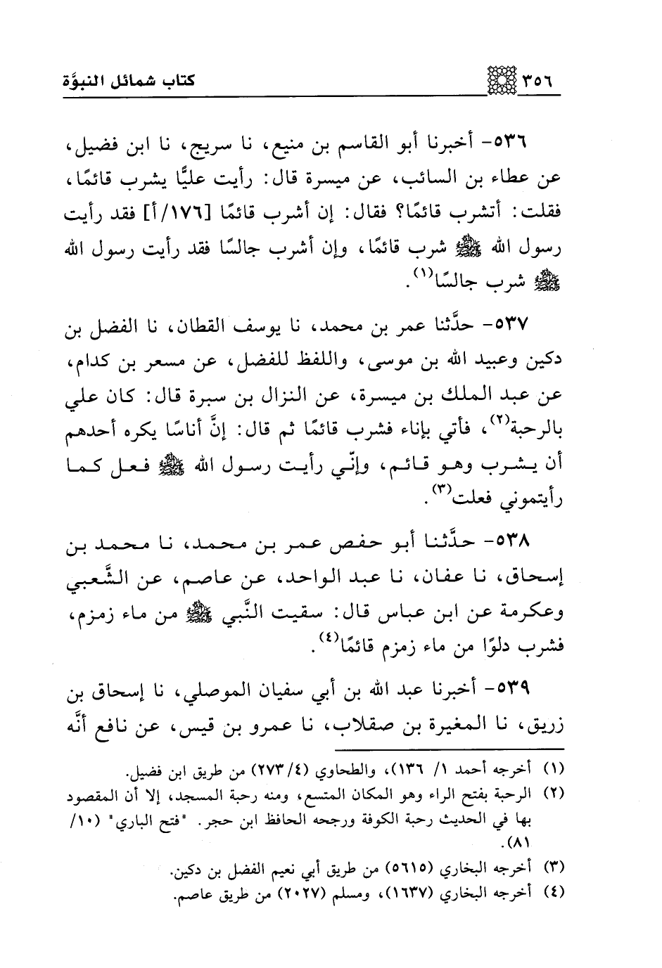 538 - حدثنا أبو حفص عمر بن محمد، نا محمد بن إسحاق، نا عفان، نا عبد الواحد، عن عاصم، عن الشعبي وعكرمة عن ابن عباس قال: سقيت النبي صلى الله عليه وسلم من ماء زمزم، فشرب دلوا من ماء زمزم قائما.