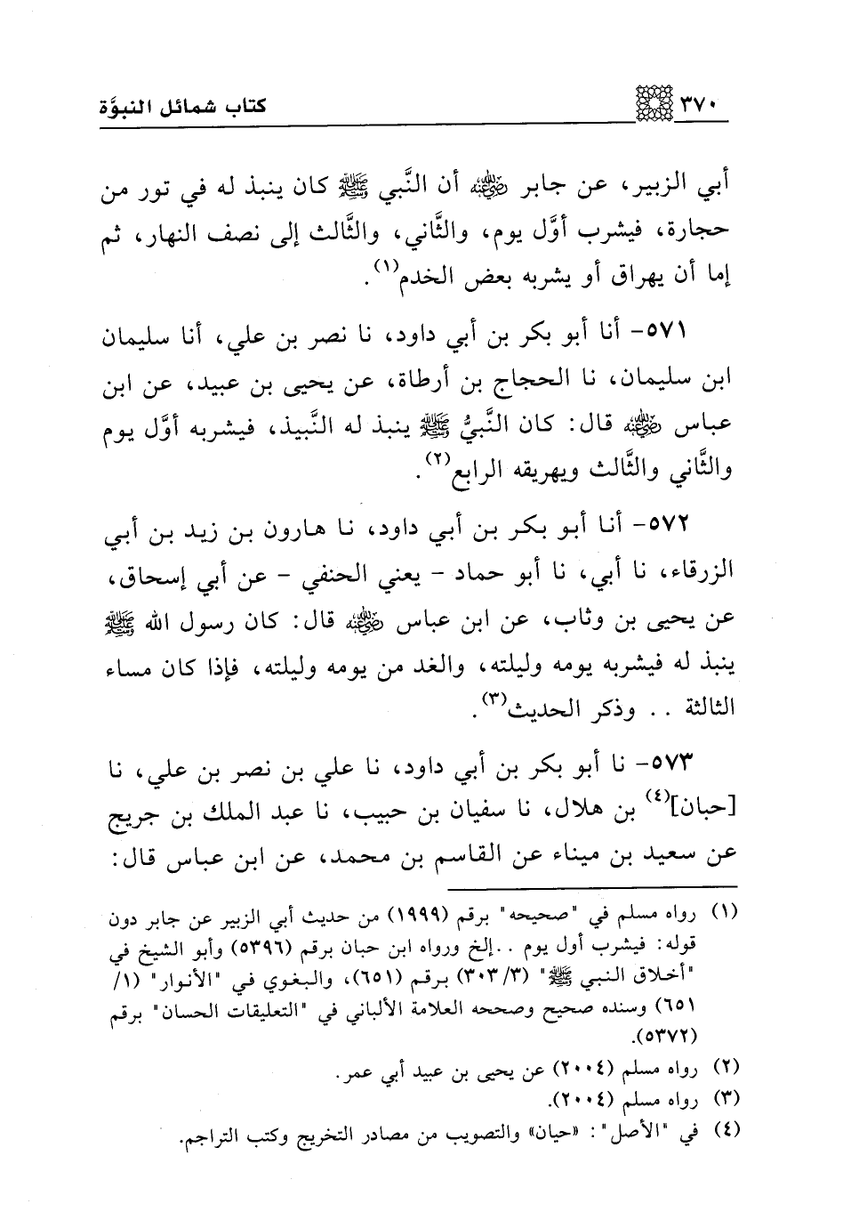 572 - أنا أبو بكر بن أبي داود، نا هارون بن زيد بن أبي الرزقاء، نا أبي، نا أبو حماد -يعني الحنفي- عن أبي إسحاق، عن يحيى بن وثاب، عن ابن عباس رضي الله عنه قال: كان رسول الله صلى الله عليه وسلم ينبذ له فيشربه وليلته، والغد من يومه وليلته، فإذا كان مساء الثالثة ... وذكر الحديث.