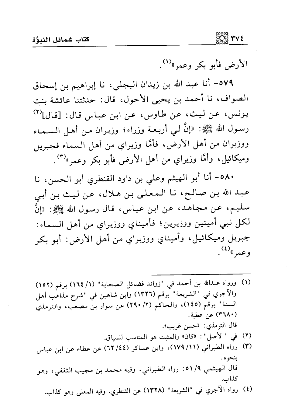 579 - أنا عبد الله بن زيدان البجلي، نا إبراهيم بن إسحاق الصواف، نا أحمد بن يحيى الأحول، قال: حدثتنا عائشة بنت يونس، عن ليث، عن طاوس، عن ابن عباس قال: [قال] رسول الله صلى الله عليه وسلم: "إن لي أربعة وزراء، وزيران من أهل السماء ووزيران من أهل الأرض، فأما وزيراي من أهل السماء فجبريل وميكائيل، وأما وزيراي من أهل الأرض فأبو بكر وعمر".