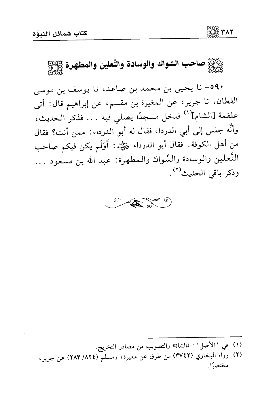 590 - نا يحيى بن محمد بن صاعد، نا يوسف بن موسى القطان، نا جرير، عن المغيرة بن مقسم، عن إبراهيم قال: أتى علقمة [الشام] فدخل مسجدا يصلي فيه ..... فذكر الحديث، وأنه جلس إلى أبي الدرداء فقال له أبو الدرداء: ممن أنت؟ فقال من أهل الكوفة. فقال أبو الدرداء رضي الله عنه: أولم يكن فيكم صاحب النعلين والوسادة والسواك والمطهرة: عبد الله بن مسعود .... وذكر باقي الحديث.