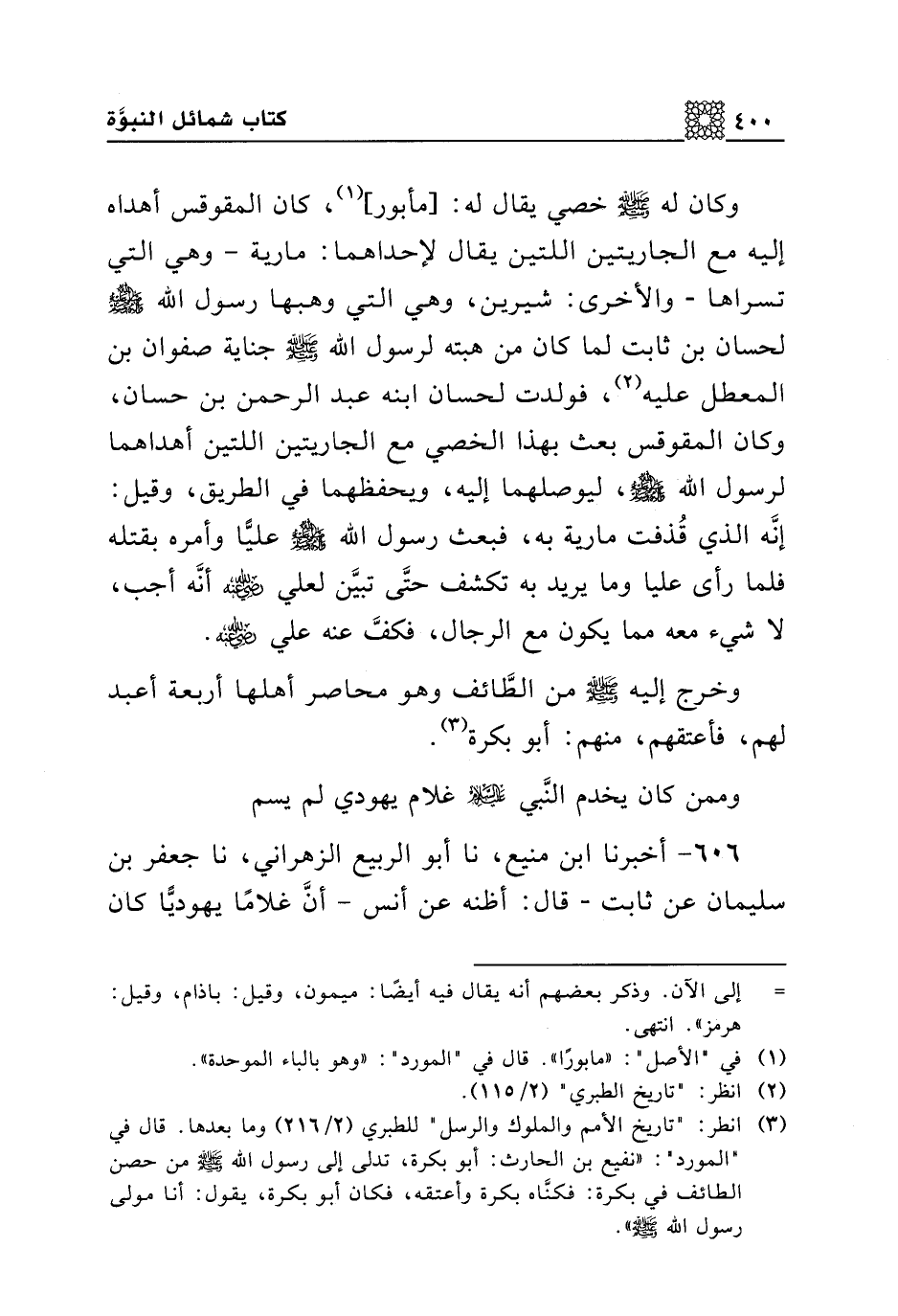 وكان له صلى الله عليه وسلم خصي يقال له: [مأبور]، كان المقوقس أهداه إليه مع الجاريتين اللتين يقال لإحداهما: مارية -وهي التي تسراها- والأخرى: شيرين، وهي التي وهبها رسول الله صلى الله عليه وسلم لحسان بن ثابت لما كان من هبته لرسول الله صلى الله عليه وسلم جناية صفوان بن المعطل عليه، فولدت لحسان ابنه عبد الرحمن بن حسان، وكان المقوقس بعث بهذا الخصي مع الجاريتين اللتين أهداهما لرسول الله صلى الله عليه وسلم، ليوصلهما إليه، ويحفظهما في الطريق، وقيل: إنه الذي قذفت مارية به، فبعث رسول الله صلى الله عليه وسلم عليا وأمره بقتله فلما رأى عليا وما يزيد به تكشف حتى تبين لعلي رضي الله عنه أنه أجب، لا شيء معه مما يكون مع الرجال، فكف عنه علي رضي الله عنه.