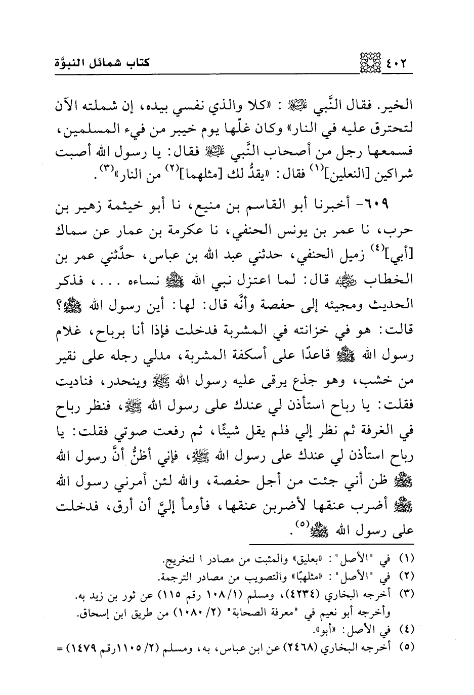 609 - أخبرنا أبو القاسم بن منيع، نا أبو خيثمة زهير بن حرب، نا عمر بن يونس الحنفي، نا عكرمة بن عمار عن سماك [أبي] زميل الحنفي، حدثني عبد الله بن عباس، حدثني عمر بن الخطاب رضي الله عنه قال: لما اعتزل نبي الله صلى الله عليه وسلم نساءه ..... ، فذكر الحديث ومجيئه إلى حفصه وأنه قال: لها: أين رسول الله صلى الله عليه وسلم؟ قالت: هو في خزانته في المشربة فدخلت فإذا أنا برباح، غلام رسول الله صلى الله عليه وسلم قاعدا على أسكفة المشربة، مدلي رجله على نقير من خشب، وهو جذع يرقى عليه رسول الله صلى الله عليه وسلم وينحدر، فناديت فقلت: يا رباح استأذن لي عندك على رسول الله صلى الله عليه وسلم، فنظر رباح في الغرفة ثم نظر إلي فلم يقل شيئا، ثم رفعت صوتي فقلت: يا رباح استأذن لي عندك على رسول الله صلى الله عليه وسلم، فإني أظن أن رسول الله صلى الله عليه وسلم ظن أني جئت من أجل حفصة، والله لئن أمرني رسول الله صلى الله عليه وسلم أضرب عنقها لأضربن عنقها، فأومأ إلي أن أرق، فدخلت على رسول الله صلى الله عليه وسلم.