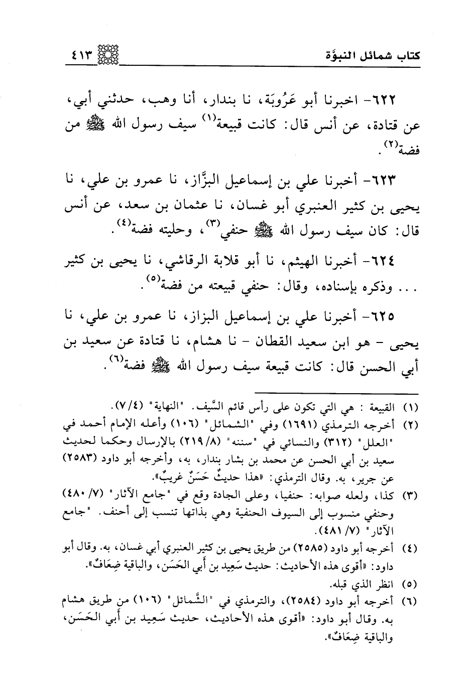 624 - أخبرنا الهيثم، نا أبو قلابة الرقاشي، نا يحيى بن كثير ... وذكره بإسناده، وقال: حنفي قبيعته من فضة.
