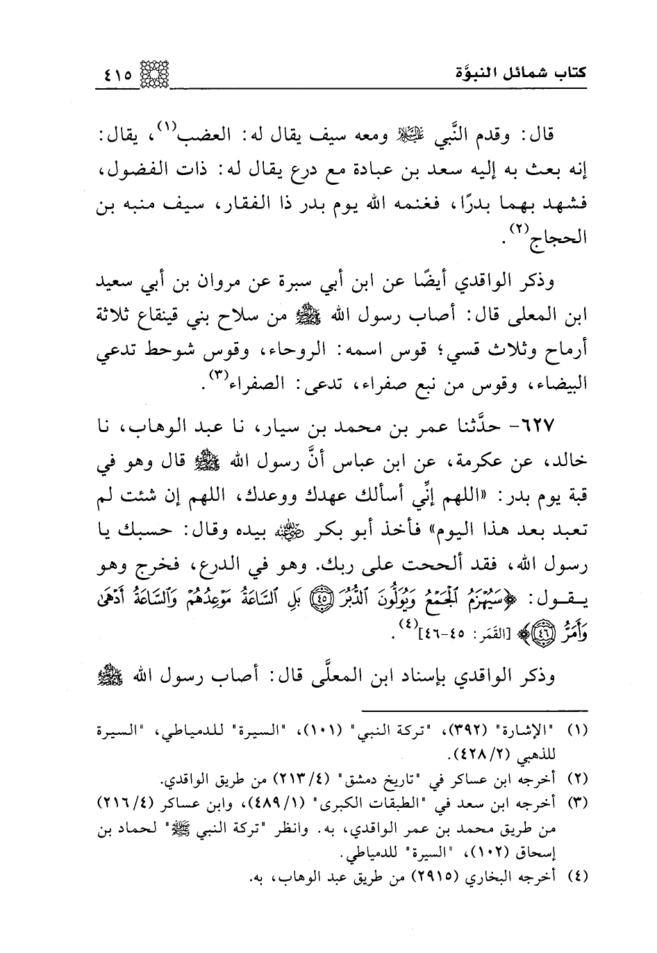 627 - حدثنا عمر بن محمد بن سيار، نا عبد الوهاب، نا خالد، عن عكرمة، عن ابن عباس أن رسول الله صلى الله عليه وسلم قال وهو في قبة يوم بدر: "اللهم إني أسألك عهدك ووعدك، اللهم إن شئت لم تعبد بعد هذا اليوم" فأخذ أبو بكر رضي الله عنه بيده وقال: حسبك يا رسول الله، فقد ألححت على ربك. وهو في الدرع، فخرج وهو يقول: {سيهزم الجمع ويولون الدبر * بل الساعة موعدهم والساعة أدهى وأمر}.