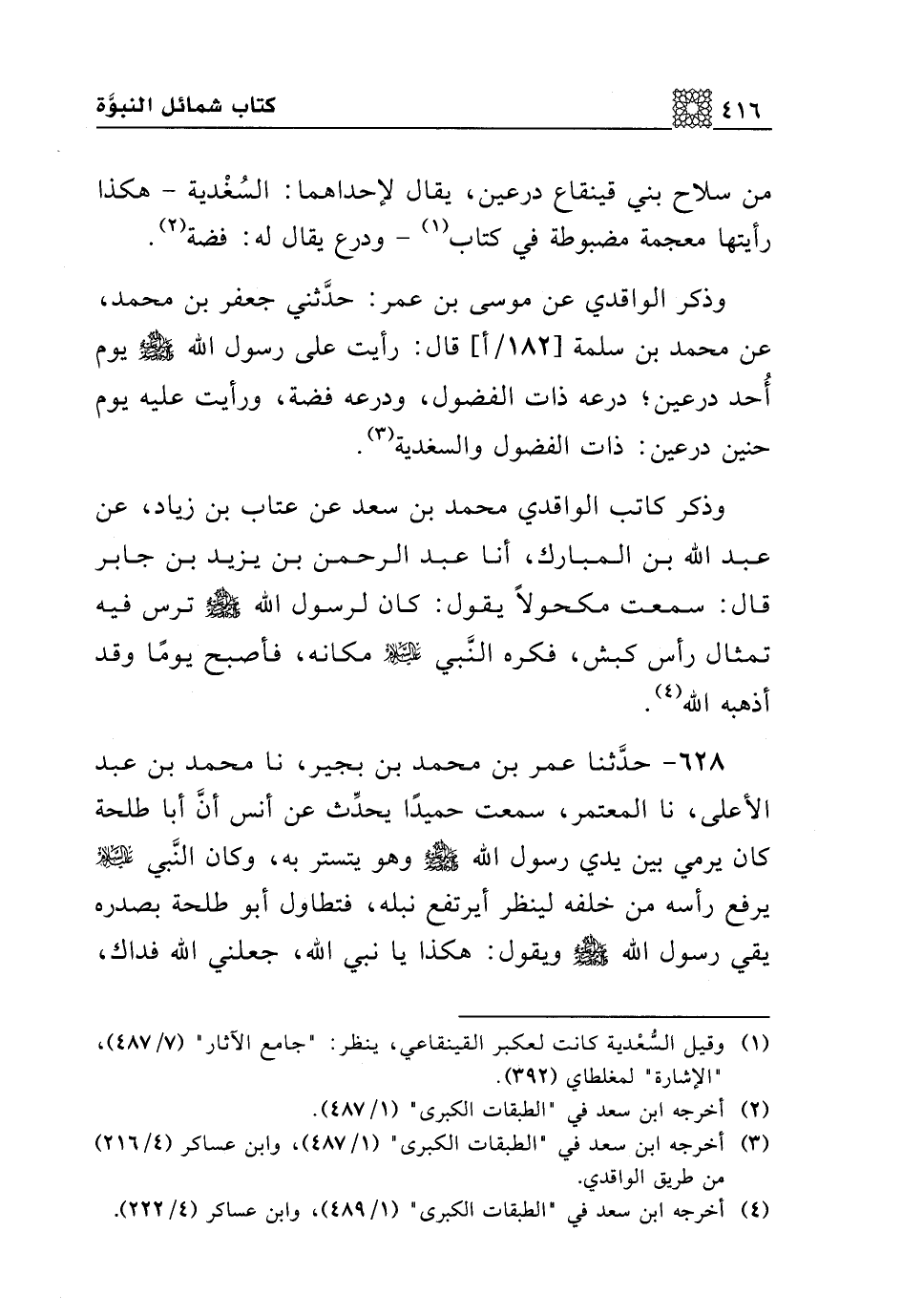 628 - حدثنا عمر بن محمد بن بجير، نا محمد بن عبد الأعلى، نا المعتمر، سمعت حميدا يحدث عن أنس أن أبا طلحة كان يرمي بين يدي رسول الله صلى الله عليه وسلم وهو يتستر به، وكان النبي عليه السلام يرفع رأسه من خلفه لينظر أيرتفع نبله، فتطاول أبو طلحة بصدره يقي رسول الله صلى الله عليه وسلم ويقول: هكذا يا نبي الله، جعلني الله فداك، نحري دون نحرك. وروى [ابن] المبارك، عن الأوزاعي، عن إسحاق بن عبد الله بن أبي طلحة قال: كان النبي عليه السلام يتترس هو وأبو طلحة بترس واحد.