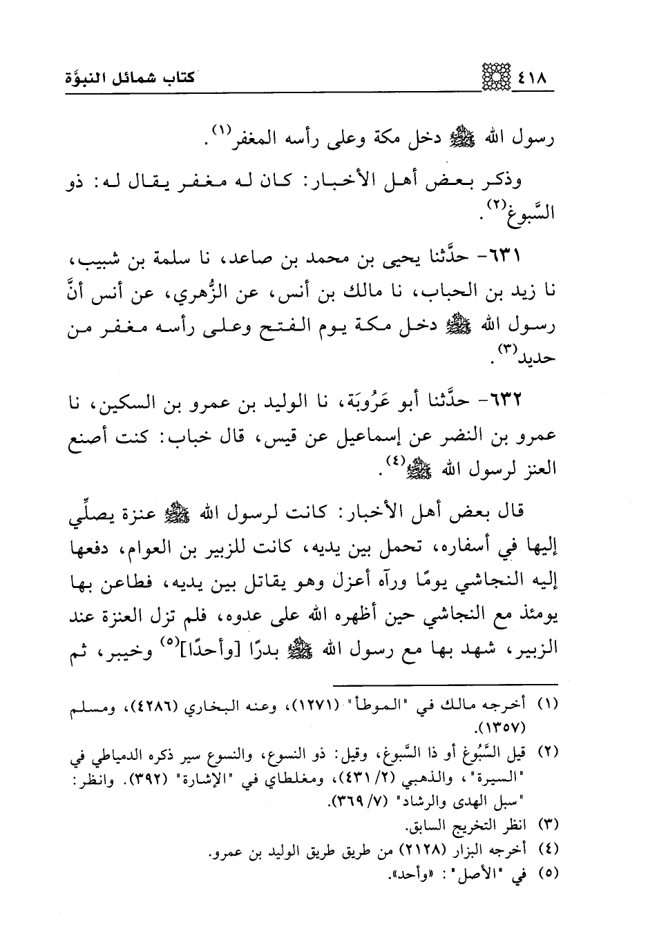 631 - حدثنا يحيى بن محمد بن صاعد، نا سلمة بن شبيب، نا زيد بن الحباب، نا مالك بن أنس، عن الزهري، عن أنس أن رسول الله صلى الله عليه وسلم دخل مكة يوم الفتح وعلى رأسه مغفر من حديد.