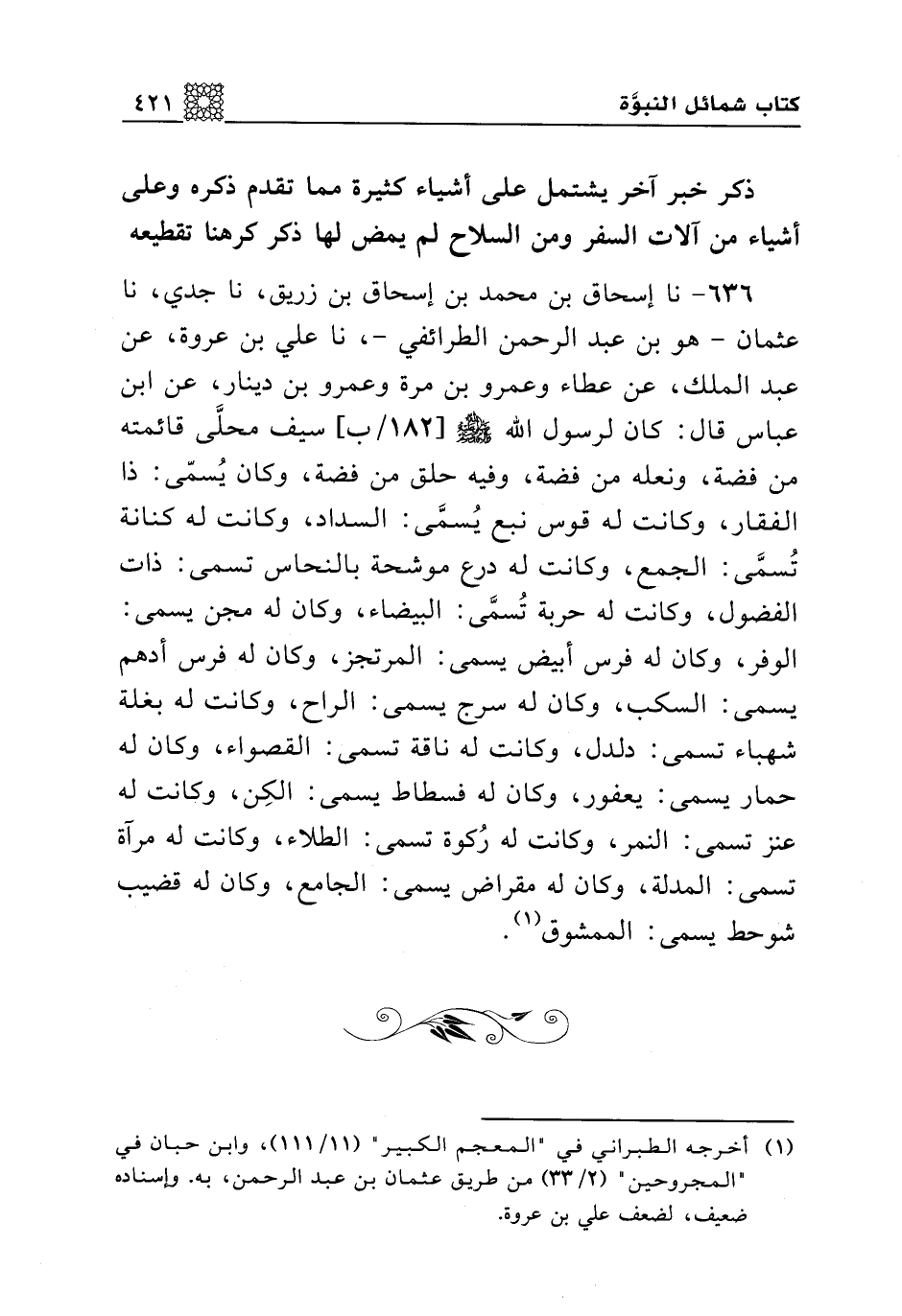 636 - نا إسحاق بن محمد بن إسحاق بن زريق، نا جدي، نا عثمان -هو ابن عبد الرحمن الطرائفي-، نا علي بن عروة، عن عبد الملك، عن عطاء وعمرو بن مرة وعمرو بن دينار، عن ابن عباس قال: كان لرسول الله صلى الله عليه وسلم سيف محلى قائمته من فضة، ونعله من فضة، وفيه حلق من فضة، وكان يسمى: ذا الفقار، وكانت له قوس نبع يسمى: السداد، وكانت له كنانة تسمى: الجمع، وكانت له درع موشحة بالنحاس تسمى: ذات الفضول، وكانت له حربة تسمى: البيضاء، وكان له مجن يسمى: الوفر، وكان له فرس أبيض يسمى: المرتجز، وكان له فرس أدهم يسمى: السكب، وكان له سرج يسمى: الراح، وكانت له بغلة شهباء تسمى: دلدل، وكانت له ناقة تسمى: القصواء، وكان له حمار يسمى: يعفور، وكان له فسطاط يسمى: الكِن، وكانت له عنز تسمى: النمر، وكانت له ركوة تسمى: الطلاء، وكانت له مرآة تسمى: المدلة، وكان له مقراض يسمى: الجامع، وكان له قضيب شوحط يسمى: الممشوق.