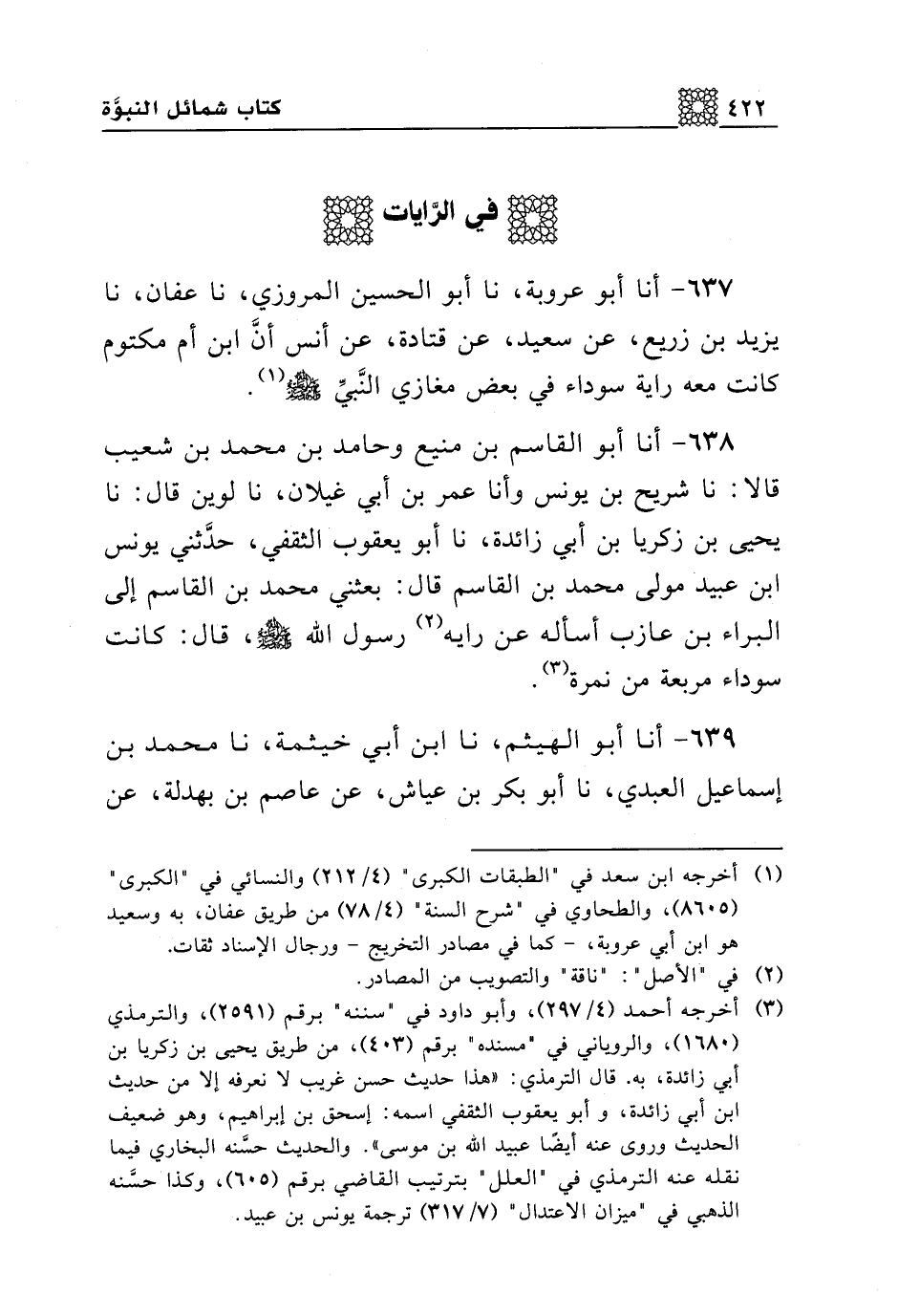 638 - أنا أبو القاسم بن منيع وحامد بن محمد بن شعيب قالا: نا شريح بن يونس وأنا عمر بن أبي غيلان، نا لوين قال: نا يحيى بن زكريا بن أبي زائدة، نا أبو يعقوب الثقفي، حدثني يونس بن عبيد مولى محمد بن القاسم قال: بعثني محمد بن القاسم إلى البراء بن عازب أسأله عن رايه رسول الله صلى الله عليه وسلم، قال: كانت سوداء مربعة من نمرة.