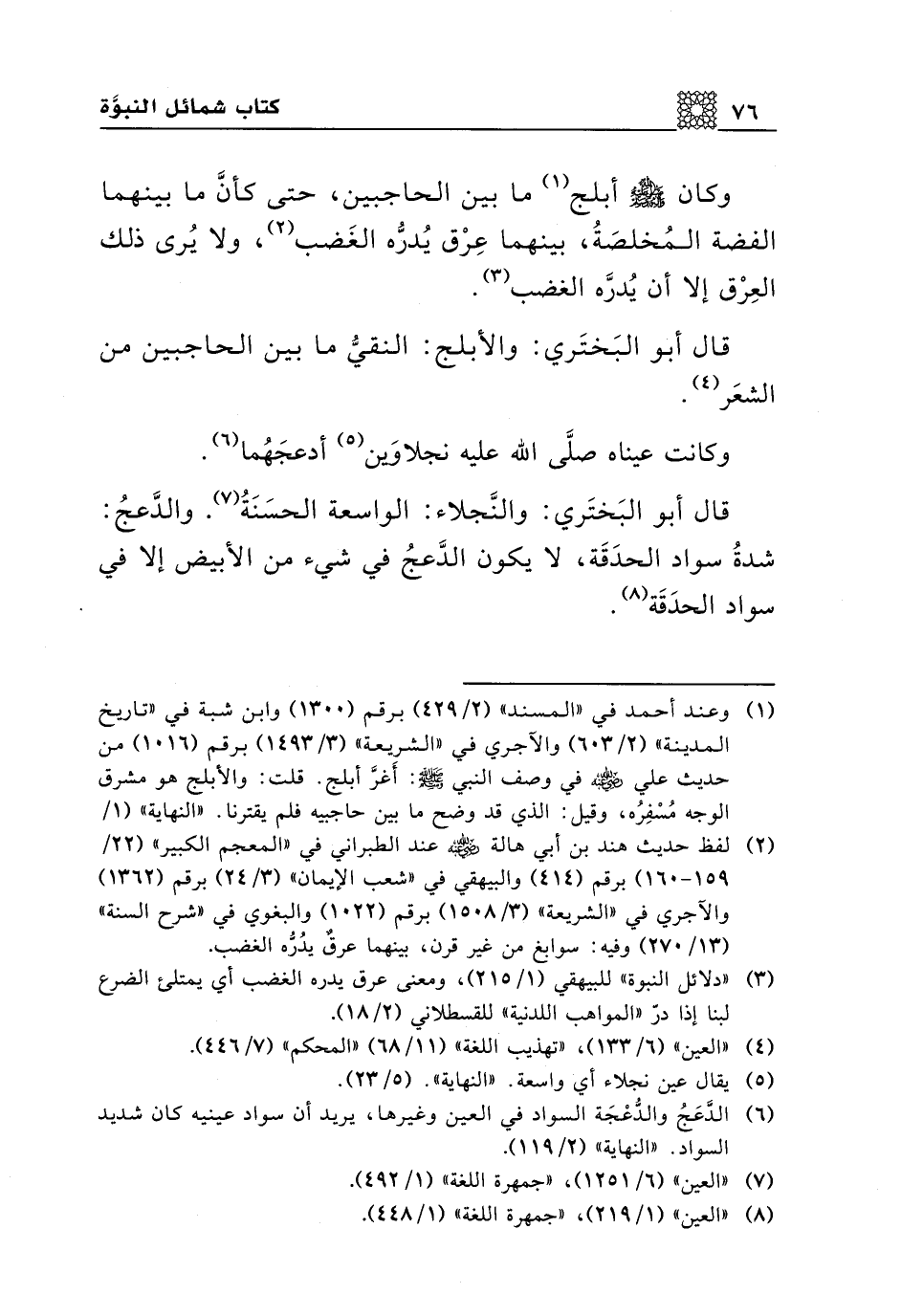 وكان صلى الله عليه وسلم أبلج ما بين الحاجبين، حتى كأن ما بينهما الفضة المخلصة، بينهما عرق يدره الغضب، ولا يرى ذلك العرق إلا أن يدره الغضب.