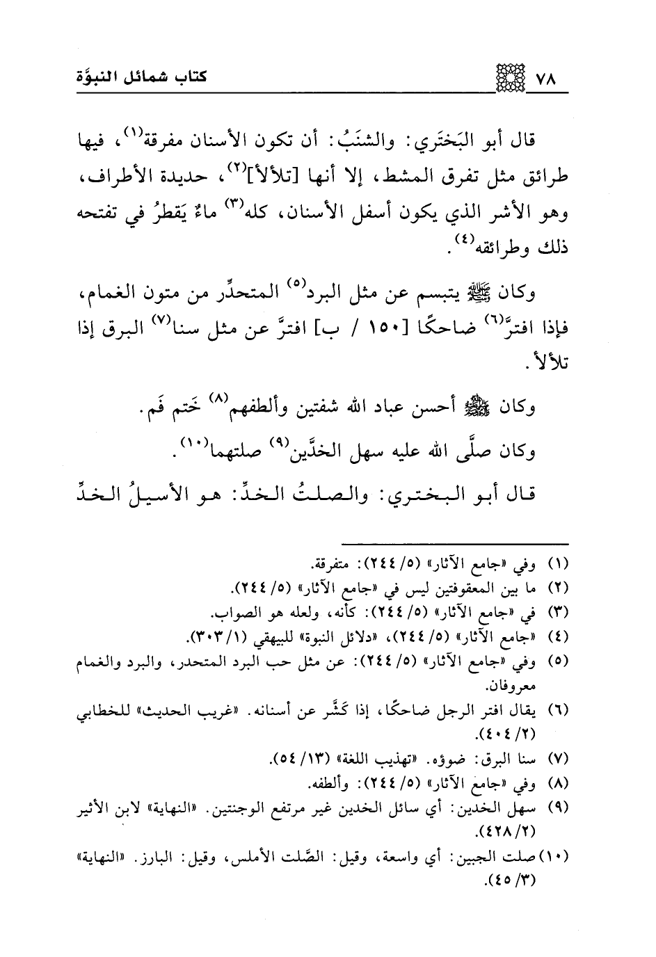 قال أبو البختري: والشنب: أن تكون الأسنان مفرقة، فيها طرائق مثل تفرق المشط، إلا أنها [تلألأ]، حديدة الأطراف، وهو الأشر الذي يكون أسفل الأسنان، كله ماء يقطر في تفتحه ذلك وطرائقه.