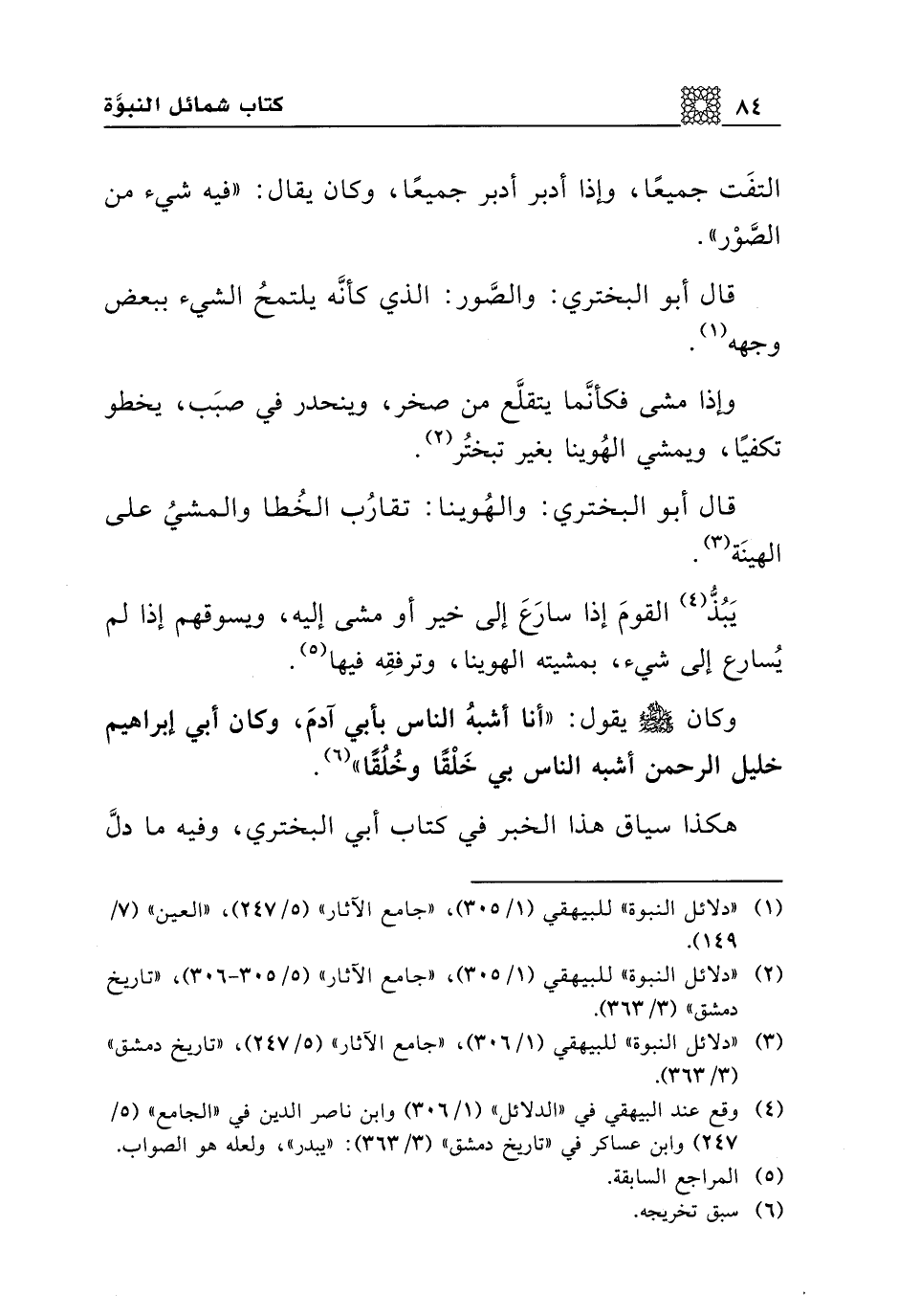 وإذا مشى فكأنما يتقلع من صخر، وينحدر في صبب، يخطو تكفيا، ويمشي الهوينا بغير تبختر.