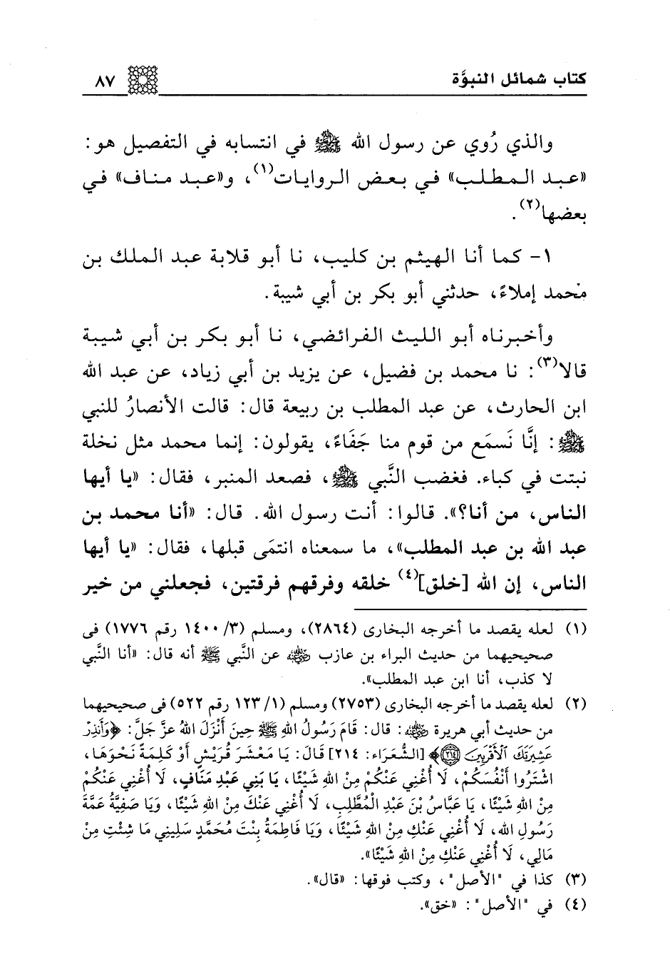 والذي روي عن رسول الله صلى الله عليه وسلم في انتسابه في التفصيل هو: "عبد المطلب" في بعض الروايات، و"عبد مناف" في بعضها.
