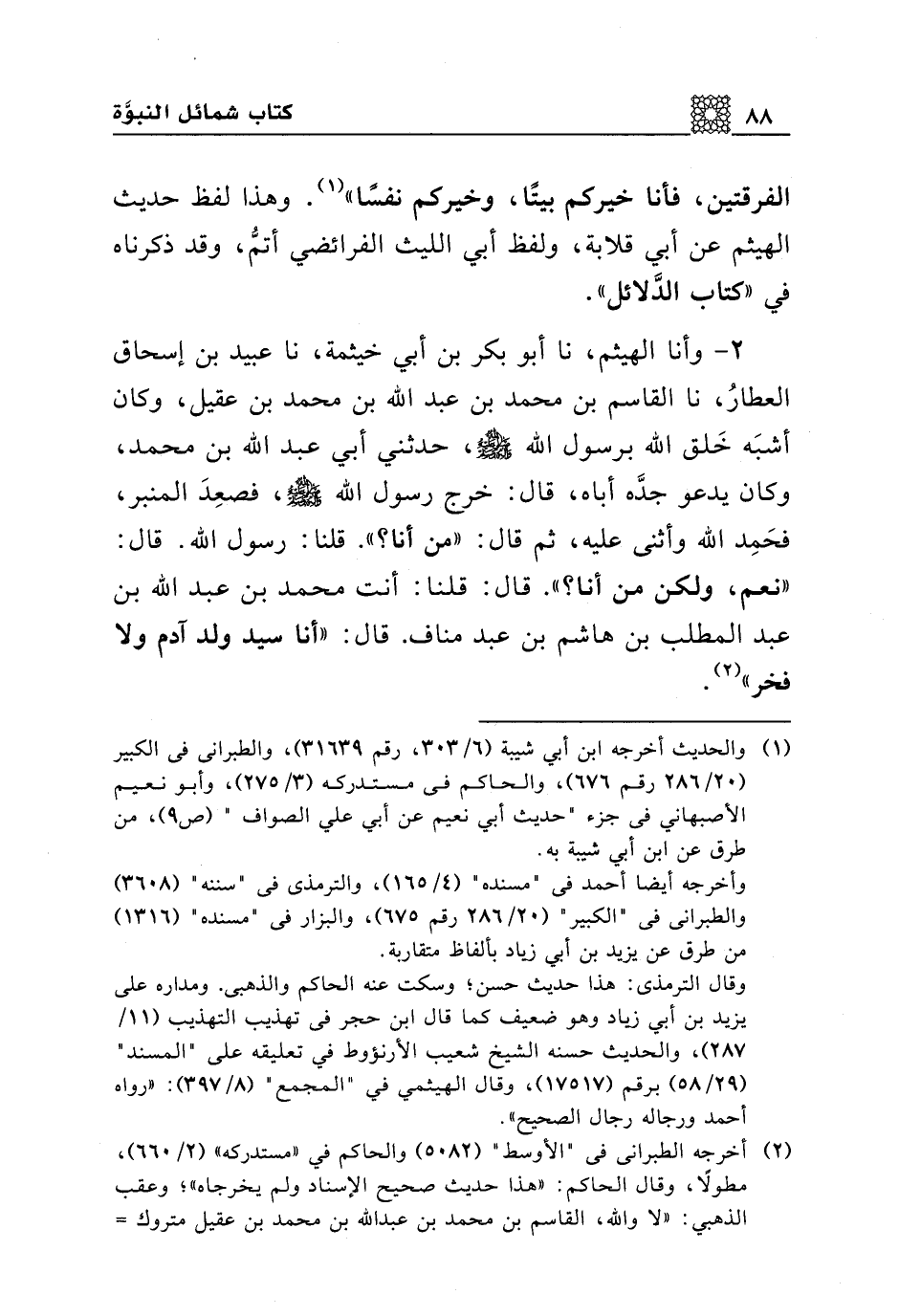 2 - وأنا الهيثم، نا أبو بكر بن أبي خيثمة، نا عبيد بن إسحاق العطار، نا القاسم بن محمد بن عبد الله بن محمد بن عقيل، وكان أشبه خلق الله برسول الله صلى الله عليه وسلم، حدثني أبي عبد الله بن محمد، وكان يدعو جده أباه، قال: خرج رسول الله صلى الله عليه وسلم، فصعد المنبر، فحمد الله وأثنى عليه، ثم قال: "من أنا"؟. قلنا: رسول الله. قال: "نعم، ولكن من أنا؟ ". قال: قلنا: أنت محمد بن عبد الله بن عبد المطلب بن هاشم بن عبد مناف. قال: "أنا سيد ولد آدم ولا فخر".