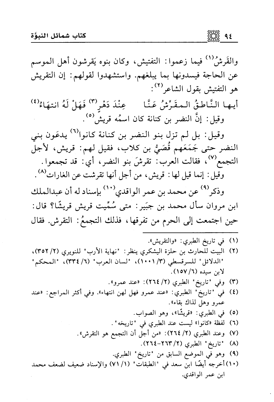 وذكر عن محمد بن عمر الواقدي بإسناد له أن عبد الملك بن مروان سأل محمد بن جبير: متى سميت قريش قريشا؟ قال: حين اجتمعت إلى الحرم من تفرقها، فذلك التجمع: التقرش. فقال