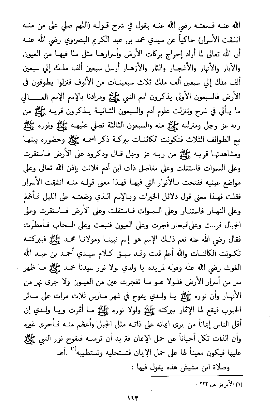 استوى على العرش ومن نور النبي ـ صلى الله عليه وسلم ـ خلق الله جميع الأكوان بعد ذلك السماوات والأرض والملائكة والإنس والجن وسائر المخلوقات. فأصبحت الحقيقة المحمدية ـ في زعمه ـ الصورة الكاملة المتجسدة للذات الإلهية التي لا ترى بذاتها، ولا تنفصل عن هذا الوجود. . فالنبي محمد ـ صلى الله عليه وسلم ـ عند ابن عربي ومشايخ التصوف الذين جاؤوا من بعده هو الله المتجلي على العرش. أو ـ قل ـ هو صورة الله المصغرة وهو الذي منه استمدت كل الموجودات وجوداتها وانفلقت عنه كل الأنوار وكل الأكوان وكل الموجودات. . وهو يعني أن محمدًا ـ صلى الله عليه وسلم ـ هو البذرة الأولى لكل موجود فكأنه بذرة لشجرة كان منها بعد ذلك الساق والفروع والأوراق والثمار والأشواك، فهكذا بدأ الوجود بمحمد ـ صلى الله عليه وسلم ـ ثم خلق من نوره العرش والكرسي والسماوات والأرض وآدم وذريته وتفرع الخلق وتدرج بعد ذلك من المخلوقات التي خلقت من نور النبي محمد ـ صلى الله عليه وسلم ـ فالموجودات كلها في عقيدة التصوف شيء واحد متفرع عن أصل واحد أو قل شجرة متفرعة عن بذرة واحدة. وإليك الآن نصوص عبارات هؤلاء الملاحدة الكافرين في هذه العقيدة الكفرية الزندقية: