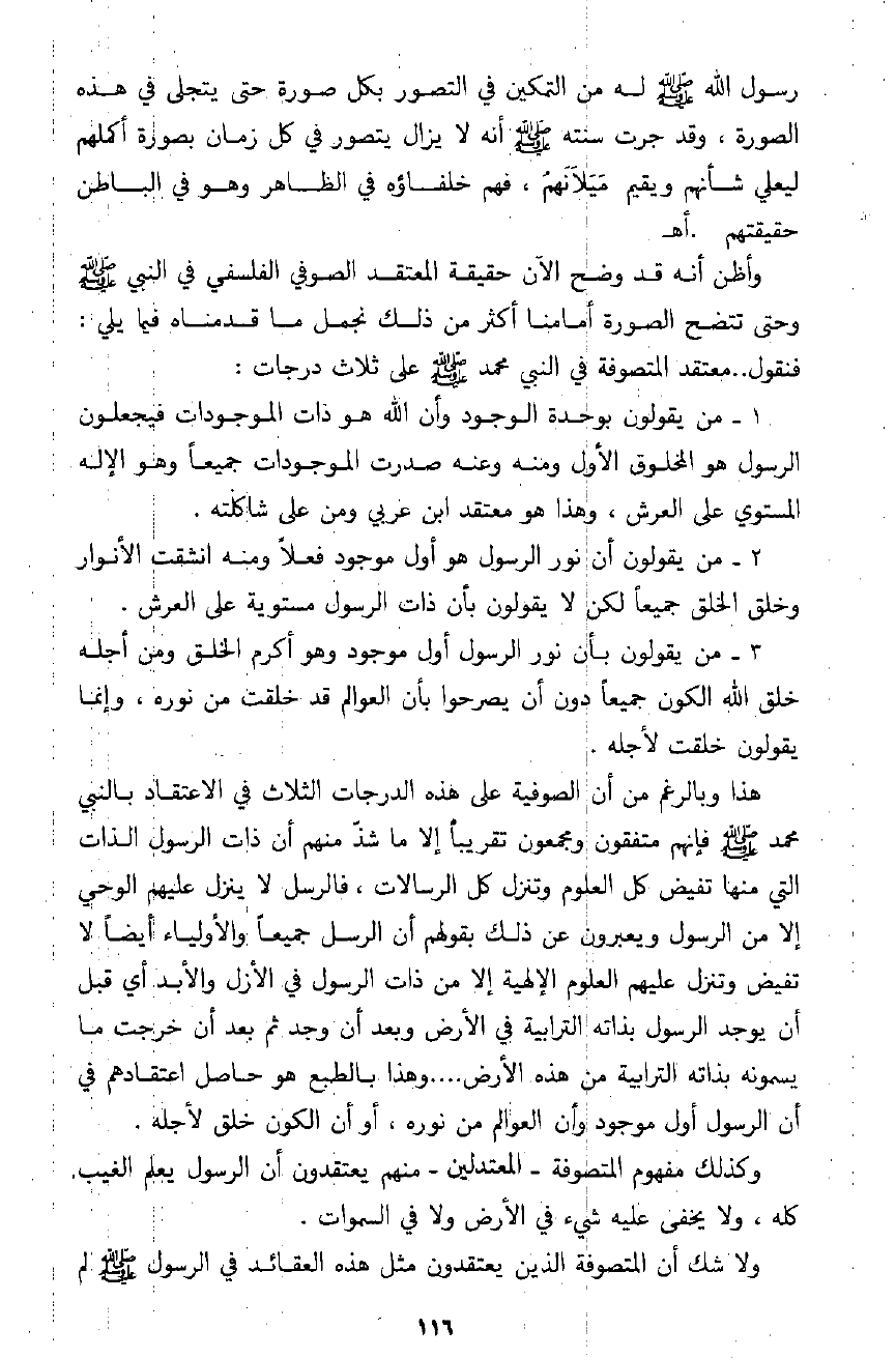 وهذا الهذيان الكامل، والتخريف الكامل شرح لعقيدة الصوفية فيما يسمونه بالحقيقة المحمدية، وأنها الذات الأولى التي انطلقت منها بعد ذلك كل الذوات