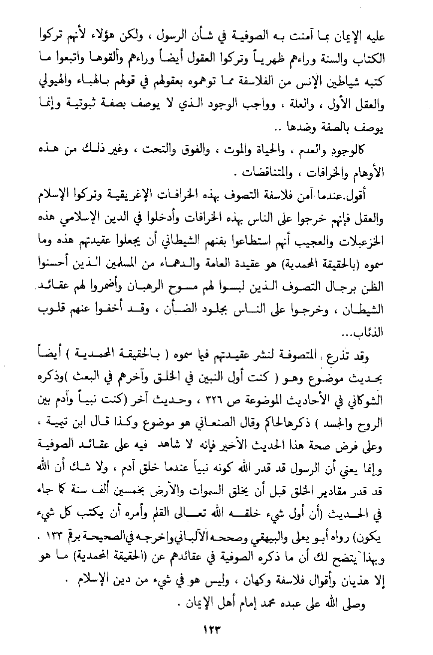 يتأثروا فقط بالفلاسفة في نظريتهم في الخلق وقولهم بالهباء، والعقل الأول أو العقل الفعال. . بل إنهم تأثروا أيضًا بما قاله النصارى في عيسى، ولا شك أن نظرية النصرانية في المسيح متأثرة بقول الفلاسفة أيضًا في العقل الفعال. ولقد استطاع المتصوفة نقل هذه النظرية بالرغم من غموضها الفلسفي، وصعوبة التدليل عليها بدليل منطقي يقبله العقل. وبمجافاة هذه النظرية عن عقيدة الإسلام الواضحة السهلة، أقول بالرغم من كل ذلك فإن المتصوفة استطاعوا أن يجعلوا هذه العقيدة هي عقيدة العوام والكثرة من المسلمين وذلك بصياغتها لعبارات سهلة، وفي شعر سلس يجري على الألسنة سريعًا كقولهم مثلًا: (لولاك ما خلقت الأفلاك) ! ! . . وكنت مرة أخطب في الحرم النبوي في نحو سنة 1381هـ ـ الموافقة 1960م تقريبًا مبينًا العقيدة الواجبة في الرسول ـ صلى الله عليه وسلم ـ فقام إلي أحد الحجاج من كبار السن وقال لي: أليس يقول الله تعالى (لولاك ما خلقت الأفلاك) فقلت: له ليست هذه بآية من القرآن، ولا بحديث أيضًا واعتقادها شرك بالله! ! فانظر كيف جرى هذا المعتقد على ألسنة الناس بكلام مسجوع يظنه العامي قرآنًا وما هو بقرآن.