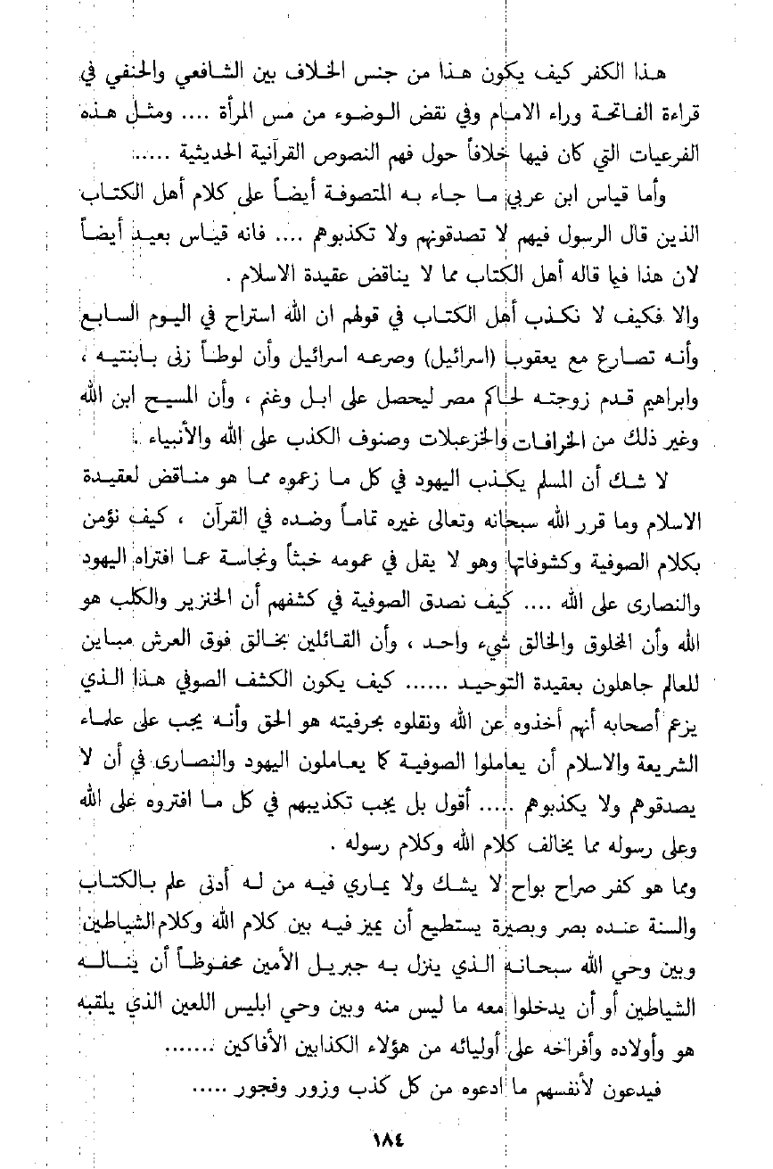 قط أمرًا غير مشروع، وما خرجت عن الكتاب والسنة في شيء من تصانيفي وقال في الباب السادس والستين وثلاثمائة: جميع ما أكتبه في تصانيفي ليس هو عن فكر ولا روية وإنما هو عن نفث في روعي من ملك الإلهام وقال في الباب السابع والستين وثلاثمائة ليس عندي بحمد الله تقليد لأحد غير رسول الله ـ صلى الله عليه وسلم ـ فعلومنا كلها محفوظة من الخطأ وقال في الباب العاشر من الفتوحات: نحن بحمد الله لا نعتمد في جميع ما نقوله إلا على ما يلقيه الله تعالى في قلوبنا لا على ما تحتمله الألفاظ وقال في الباب الثالث والسبعين وثلاثمائة: جميع ما كتبته وأكتبه إنما هو عن إملاء إلهي وإلقاء رباني أو نفث روحاني في روع كياني كل ذلك لي بحكم الإرث لا بحكم الاستقلال فإن النفث في الروع منحط عن رتبة وحي الكلام ووحي الإشارة والعبارة ففرق يا أخي بين وحي الكلام ووحي الإلهام تكن من العلماء الأعلام وقال في الباب السابع والأربعين من الفتوحات: اعلم أن علومنا وعلوم أصحابنا ليست من طريق الفكر وإنما هي من الفيض الإلهي وقال في الباب السادس والأربعين ومائتين: منها جميع علومنا من علوم الذوق لا من علم بلا ذوق فإن علوم الذوق لا تكون إلا عن تجل إلهي والعلم قد يحصل لنا بنقل المخبر الصادق وبالنظر الصحيح وقال في الباب التاسع والثمانين منها والباب الثامن والأربعين وثلاثمائة: اعلم أن ترتيب أبواب الفتوحات لم يكن عن اختيار مني ولا عن نظر فكري وإنما الحق تعالى يملي لنا على لسان ملك الإلهام جميع ما نسطره وقد نذكر كلامًا بين كلامين لا تعلق له بما قبله ولا بعده كما في قوله تعالى حافظوا على الصلوات والصلاة الوسطى بين آيات طلاق ونكاح وعدة ووفاة تتقدمها وتتأخر عنها انتهى وأطال في ذلك وقال في الباب الثامن من الفتوحات: اعلم أن العارفين رضي الله تعالى عنهم لا يتقيدون في تصانيفهم بالكلام فيما بوبوا عليه فقط وذلك لأن قلوبهم عاكفة على باب الحضرة الإلهية مراقبة لما يبرز لهم منها فمهما برز لهم كلام بادروا إلى إلقائه على حسب ما حد لهم فقد يلقون الشيء إلى ما ليس في جنسه امتثالًا لأمر ربهم وهو تعالى يعلم حكمة ذلك. انتهى. فهذه النقول
