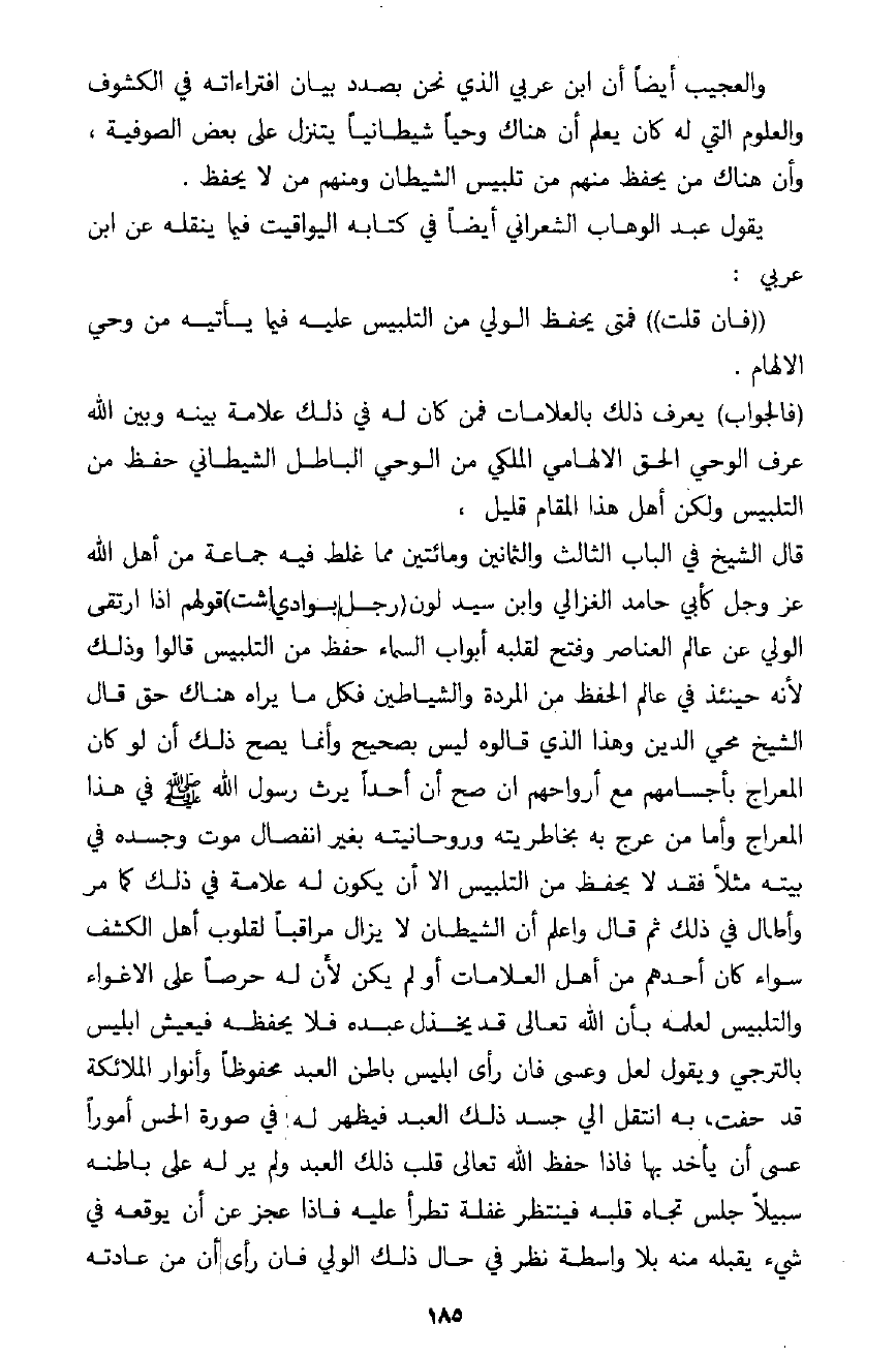 " وقال في الباب الثالث والخمسين وثلاثمائة: اعلم أنه لم يجيء لنا خبر إلهي أن بعد رسول الله ـ صلى الله عليه وسلم ـ وحي تشريع أبدًا إنما لنا وحي الإلهام. قال تعالى ولقد أوحي إليك وإلى الذين من قبلك ولم يذكر أن بعده وحيًا أبدًا. وقد جاء الخبر الصحيح في عيسى عليه السلام وكان ممن أوحي إليه قبل رسول الله ـ صلى الله عليه وسلم ـ أنه إذا نزل آخر الزمان لا يؤمنا إلا بنا أي بشريعتنا وسنتنا مع أن له الكشف التام إذا نزل زيادة على الإلهام الذي يكون له كما الخواص من هذه الأمة.