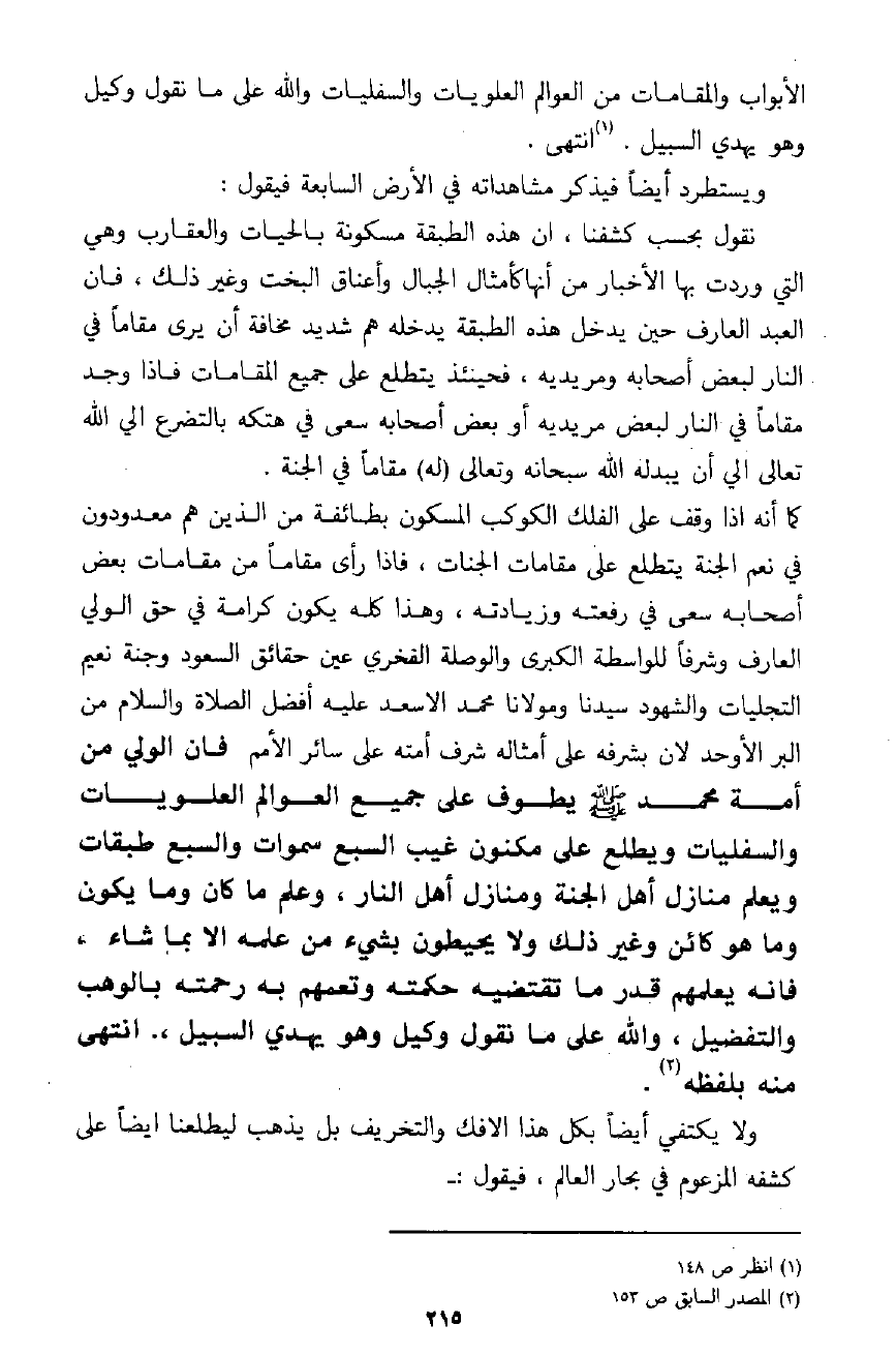 إلا الثرى من الملائكة الكروبيين وحملة العرش، وغيرهم ممن خلق الله سبحانه وتعالى في السماوات والأرض، أصغر من حيث طيران سري في القصد إليه، من خردلة بين السماء والأرض، ثم لم يزل يعرض علي من لطائف بره وكمال قدرته وعظم مملكته ما كلت الألسن عن نعته وصفته، ففي كل ذلك كنت أقول: يا عزيزي مرادي في غير ما تعرض لي، فلم ألتفت إليه إجلالًا لحرمته فلما علم الله سبحانه وتعالى من صدق الإرادة في القصد إليه فنادى: إلي إلي، وقال: يا صفي ادن مني، وأشرف على مشرفات بهائي، وميادين ضيائي، واجلس على بساط قدسي حتى ترى لطائف صنعي في آنائي، أنت صفيي وحبيبي، وخيرتي من خلقي، فكنت أذوب عند ذلك كما يذوب الرصاص، ثم سقاني شربة من عين اللطف بكأس الأنس، ثم صيرني إلى حال لم أقدر على وصفه، ثم قربني منه، وقربني حتى صرت أقرب منه من الروح إلى الجسد، ثم استقبلني روح كل نبي يسلمون علي ويعظمون أمري ويكلمونني وأكلمهم، ثم استقبلني روح محمد ـ صلى الله عليه وسلم ـ ثم سلم علي، فقال: يا أبا يزيد: مرحبًا وأهلًا وسهلًا، فقد فضلك الله على كثير من خلقه تفضيلًا، إذا رجعت إلى الأرض اقرأ لأمتي مني السلام، وانصحهم ما استطعت، وادعهم إلى الله عز وجل، ثم لم أزل مثل ذلك حتى صرت كما كان من حيث لم يكن التكوين، وبقي الحق بلا كون ولا بين ولا أين ولا حيث ولا كيف، جل جلاله وتقدست أسماؤه.