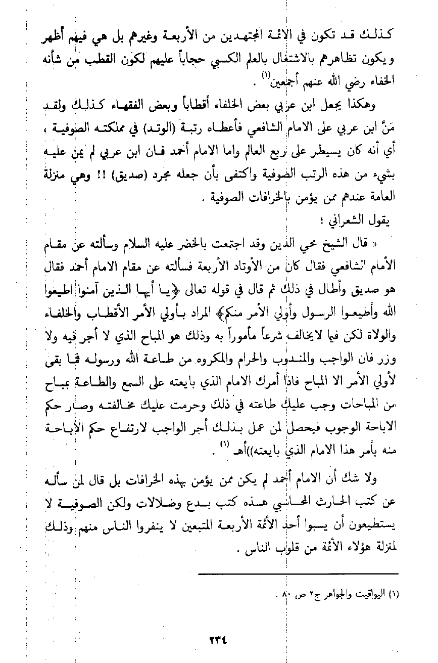 " ما قولك في مُحَدِّث، بشر بالفوز والنجاة فقال: رب اجعل لي آية تحقق لي ذلك الخبر الذي جاءني لينقطع الشك والاعتراض. فقال (أي الله) : آتيك أن أطوي لك الأرض حتى تبلغ بيني الحرام في ثلاث خطوات، وأجعل لك البحر كالأرض تمشي عليه كيف شئت وأجعل لك التراب والجو في يديك ذهبًا، ففعل هذا هل ينبغي له أن يطمئن إلى هذه البشرى بعد ظهور هذه الآية أولًا " ا. هـ منه بلفظه (ختم الولاية ص401) .