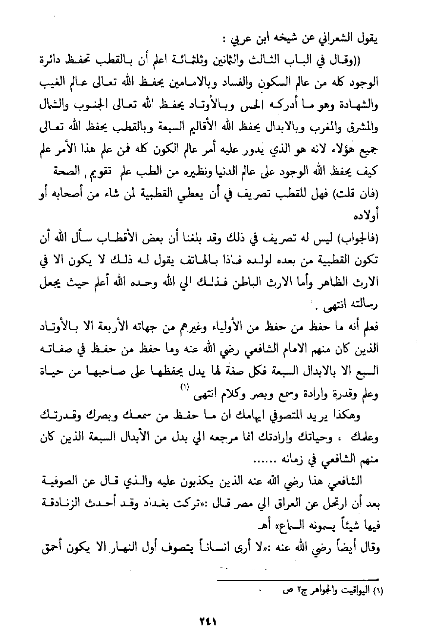 وأطال الشيخ في ذلك ثم قال فإذن القطب هو الرجل الكامل الذي حصل أربعة الدنانير منها خمسة وعشرون قيراطًا وبها توزن الرجال والأربعة هم الرسل والأنبياء والأولياء والمؤمنون فهو وارثهم كلهم ـ رضي الله عنه ـ. وقال الشيخ في الباب الحادي والخمسين وثلاثمائة: من شأن القطب الوقوف دائمًا خلف الحجاب الذي بينه وبين الحق جل وعلا فلا يرتفع حجابه حتى يموت فإن مات لقي الله ـ عز وجل ـ فهو كالحجاب الذي ينفذ أوامر الملك وليس له من الله تعالى إلا صفة الخطاب لا الشهود " (عاد إلى التلبيس مرة ثانية فزعم أن الولي يتصرف في الخلق بأمر الله) .