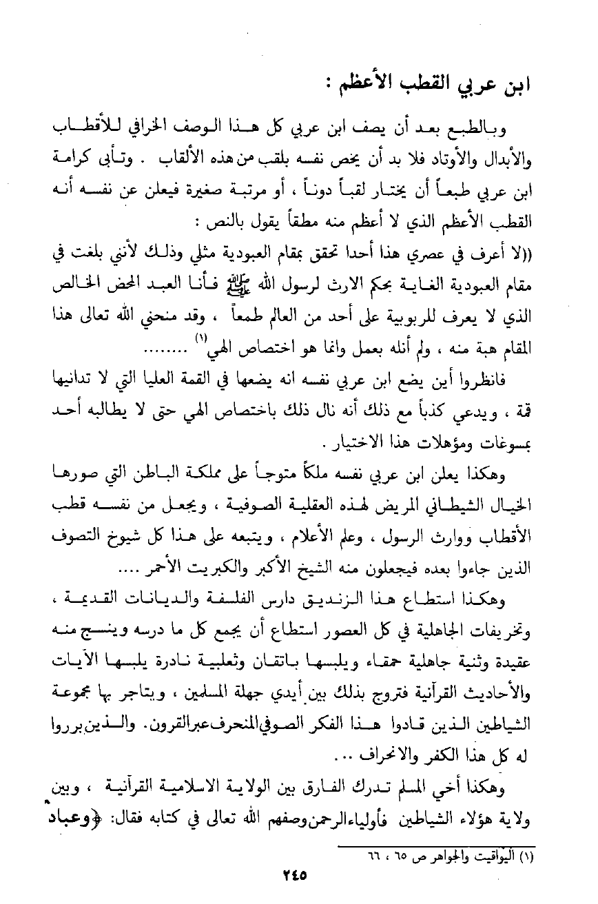 ذكرناه ومات رسول الله ـ صلى الله عليه وسلم ـ بعد ما قرر الدين الذي لا ينسخ والشرع الذي لا يتبدل دخلت الرسل كلها في شريعته ليقوموا بها فلا تخلو الأرض من رسول حي جسمه إذ هو قطب العالم الإنساني ولو كانوا في العدد ألف رسول فإن المقصود من هؤلاء هو الواحد؛ فإدريس في السماء الرابعة، وعيسى في السماء الثانية، وإلياس والخضر في الأرض. ومعلوم أن السماوات السبع من عالم الدنيا لكونها تبقى بقاء الدنيا بفنائها فهي جزء من دار الدنيا بخلاف الفلك الأطلس فإنه معدود من الآخرة في يوم القيامة تبدل الأرض غير الأرض والسماوات يعني يبدلهم بغيرهن، كما تبدل هذه النشأة الترابية منا أيها السعداء بنشأة أخرى أرقى وأصفى وألطف فهي نشأة طبيعية جسمية لا يبول أهلها ولا يتغوطون كما وردت بذلك الأخبار. وقد أبقى الله في الأرض إلياس والخضر وكذلك عيسى إذا نزل وهم من المرسلين؛ فهم القائمون في الأرض بالدين الحنيف فما زال المرسلون لا يزولون في هذه الدار لكن من باطنية شرع محمد ـ صلى الله عليه وسلم ـ ولكن أكثر الناس لا يعلمون. فالقطب هو الواحد من عيسى وإدريس وإلياس والخضر وهو أحد أركان بيت الدين وهو كركن الحجر الأسود واثنان منهم هما الإمامان وأربعتهم هم الأوتاد فبالواحد يحفظ الله الإيمان وبالثاني يحفظ الله الولاية وبالثالث يحفظ الله النبوة وبالرابع يحفظ الله الرسالة وبالمجموع يحفظ الله الدين الحنيف فالقطب من هؤلاء لا بعينه. قال الشيخ: ولكل واحد من هؤلاء الأربعة من هذه الأمة من كل زمان شخص على قلبه نائبًا عنه مع وجودهم وأكثر الأولياء لا يعرفون القطب والإمامين والأوتاد ولا النواب ولا هؤلاء المرسلين الذين ذكرناهم، ولها يتطاول كل أحد لنيل هذه المقامات ثم إذا خصوا بها عرفوا عند ذلك أنهم نواب لذلك القطب فاعرف هذه النكتة فإنك لا تراها في كلام أحد غيرنا ولولا ما ألقي في سري من إظهارها ما أظهرتها " (اليواقيت والجواهر ج2 ص81) انتهى منه بلفظه.