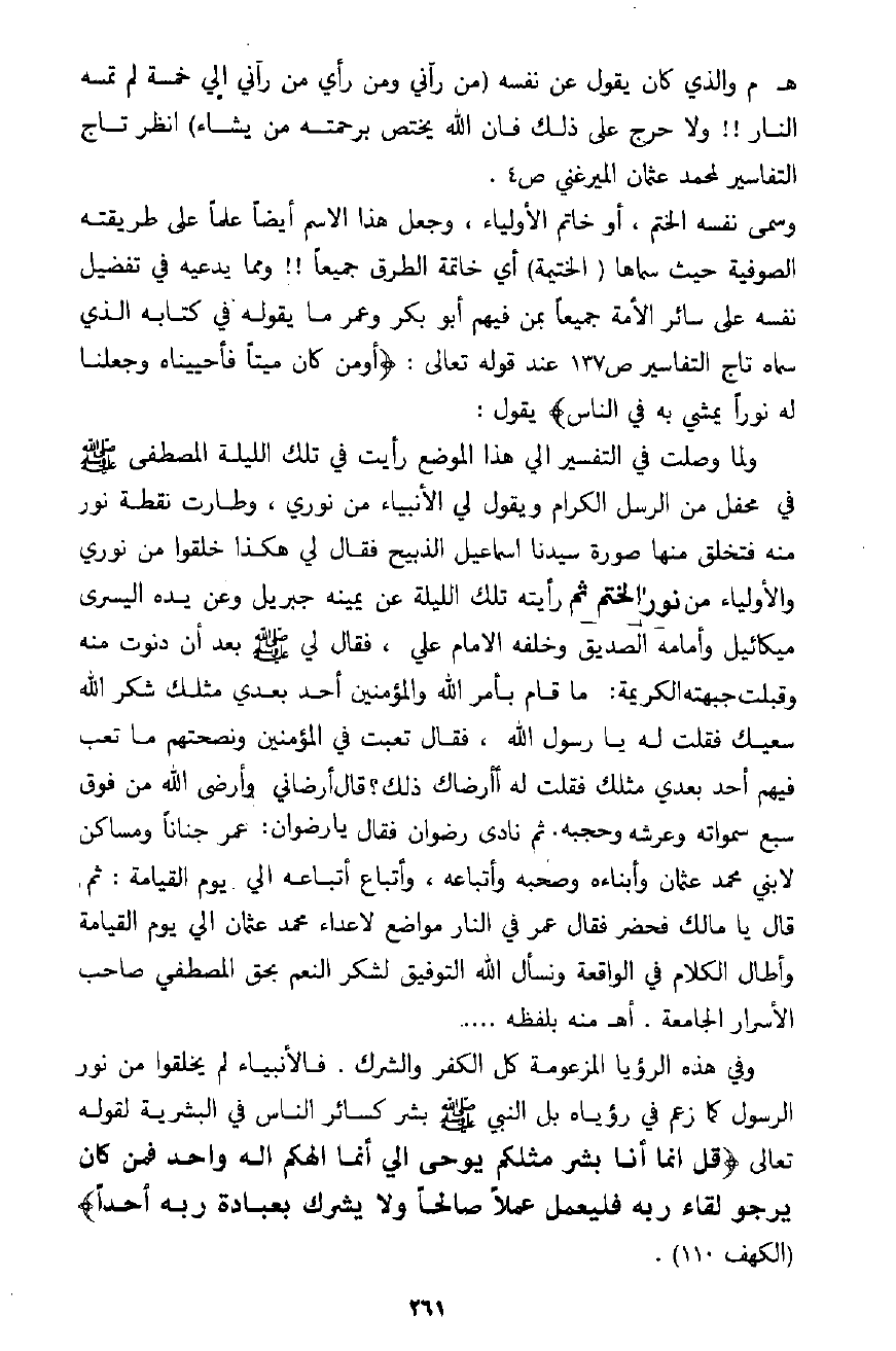 قال له: أما قوله تعالى: {فلا يأمن مكر الله إلا القوم الخاسرون} [الأعراف: 99] . فهذا قوله تعالى، لا ريب فيه ولا في قبوله. وهو أنه لا يعلم ما حاله عند الله تعالى فإن أمن فهو خاسر جاهل. كأنه حكم على الله من غير أن يحكمه. فأما من بشره الله فرد بشراه فقد اجترم، كما اجترم ذلك الآخر، فهذا من ذلك الوجه، فحق على من لا يعلم، أن لا يأمن، وحق على من أمن أن يأمن، فليس الأنبياء عليهم السلام كانوا يؤمنون (من أنفسهم) ولكن لما أُمِّنوا أَمِنُوا والأنبياء لهم عقدة النبوة والأولياء لهم عقدة الولاية. . " ا. هـ (ختم الأولياء ص387-388) .