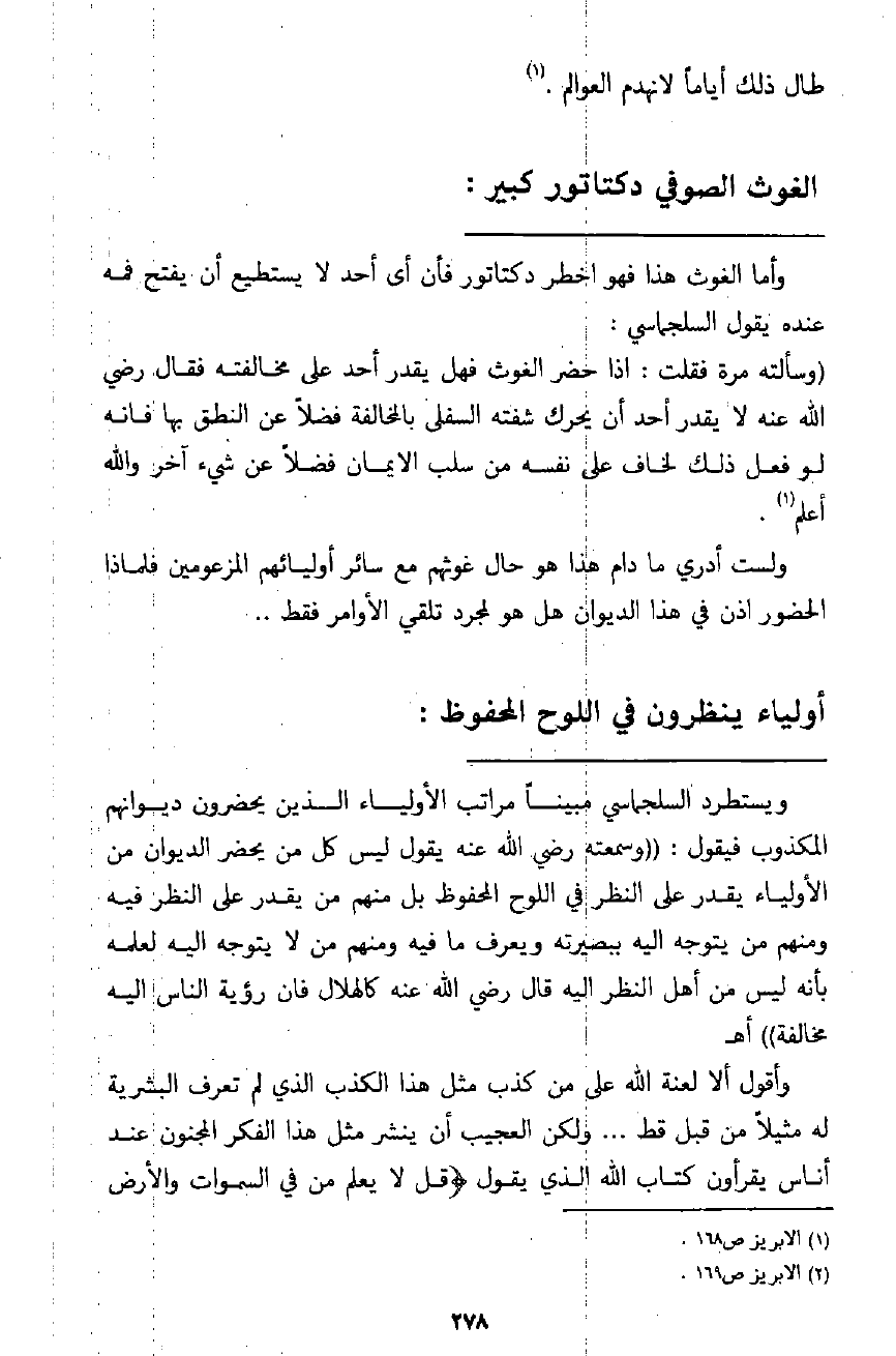 وأما من دخل زمرتنا وتأخر عنها ودخل غيرها تحل به مصائب الدنيا وأخرى ولا يفلح أبدًا (هامش: قلت فانظر كيف يهدم كل صاحب طريق صوفي طريق غيره من الكاذبين الضالين من أمثاله. واعتبر! !) . ثم قال ناقلًا عن شيخه التجاني كما هو في جواهر المعاني: وليس لأحد من الرجال أن يدخل كافة أصحابه الجنة بلا حساب ولا عقاب ولو عملوا من الذنوب ما عملوا وبلغوا إلا أنا وحدي. ووراء ذلك مما ذكر لي فيهم وضمنه أمر لا يحل لي ذكره ولا يرى ولا يعرف إلا في الدار الآخرة بشرى للمعتقد علي رغم أنف المنتقد. ثم استطرد صاحب الرماح ومن هنا صار جميع أهل طريقته أعلى مرتبة عند الله تعالى في الآخرة من أكابر الأقطاب وإن كان بعضهم في الظاهر من جملة العوام المحجوبين.