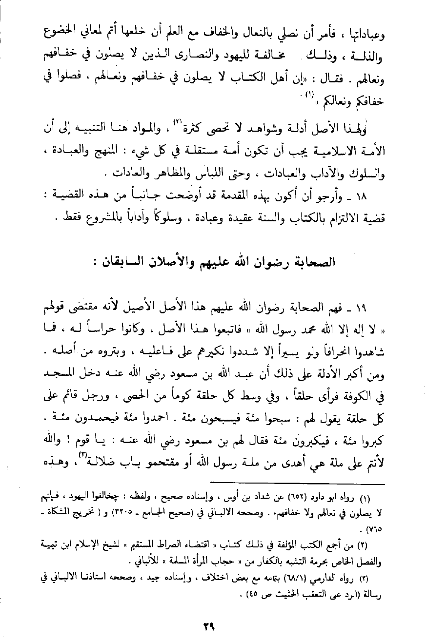 هـ ـ ـ وأبلغ هذه الأدلة كلها في مسألة التعبد والتقرب، أنه لا يجوز فيه إلا اتباع المشروع، والتقيد بالكتاب والسنة هو حديث النفر الثلاثة الذين أتوا إلى بيوت النبي ـ صلى الله عليه وسلم ـ فسألوا عن عبادته، فلما أخبروا كأنهم تقالوها، فقال أحدهم: وأين نحن من رسول الله ـ صلى الله عليه وسلم ـ! إن الله قد غفر له ما تقدم من ذنبه وما تأخر. أما أنا فأقوم ولا أنام، وقال الآخر: أما أنا فأصوم ولا أفطر، وقال الثالث: أما أنا فلا أتزوج النساء. فلما رجع رسول الله ـ صلى الله عليه وسلم ـ وأخبر خبرهم صعد المنبر، وجمع الناس ثم قال: (ما بال أقوام يقولون كذا. . أما إن أعلمكم بالله، وأتقاكم لله أنا، أما إني لأصوم وأفطر، وأقوم وأنام، وأتزوج النساء، فمن رغب عن سنتي فليس مني) (رواه البخاري ومسلم عن أنس ـ رضي الله عنه ـ وليس فيه صعود المنبر وجمع الناس) .