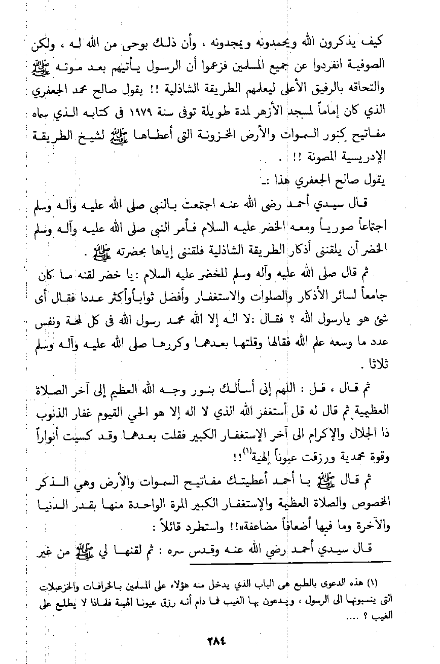 من أوليائه في إجابة دعوته أن يتوسل إليه تعالى بولي ميت فإنه أنجع للمقصود وأقرب لإجابة دعوته. ثالثها أن ذات الميت لا ظل لها فإذا وقف الميت بينك وبين الشمس فإنك لا ترى له ظلًا وسره أنه يحضر بذات روحه لا بذاته الفانية الترابية وذات الروح خفيفة لا ثقيلة وشفافة لا كثيفة قال لي ـ رضي الله عنه ـ وكم مرة أذهب إلى الديوان أو إلى مجمع من ملجأ الأولياء وقد طلعت الشمس فإذا رأوني من بعيد استقبلوني فأراهم بعين رأسي متميزين هذا بظله وهذا لا ظل له. قال ـ رضي الله عنه ـ والأموات الحاضرون في الديوان ينزلون إليه من البرزخ يطيرون طيرًا بطيران الروح فإذا قربوا من موضع الديوان بنحو مسافة نزلوا إلى الأرض ومشوا على أرجلهم إلى أن يصلوا إلى الديوان تأدبًا مع الأحياء وخوفًا منهم. قال وكذا رجال الغيب إذا زار بعضهم بعضًا فإنه يجيء بسير روحه فإذا قرب من موضعه تأدب ومشى مشي ذاته الثقيلة تأدبًا وخوفًا. قال وتحضره الملائكة وهم من وراء الصفوف ويحضر أيضًا الجن الكمل وهم الروحانيون وهم من وراء الجميع وهم لا يبلغون صفًا كاملًا قال ـ رضي الله عنه ـ وفائدة حضور الملائكة والجن أن الأولياء يتصرفون في أمور تطيق ذواتهم الوصول إليها وفي أمور أخرى لا تطيق ذواتهم الوصول إليها فيستعينون بالملائكة وبالجن في الأمور التي لا تطيق ذواتهم الوصول إليها " ا. هـ منه بلفظه (الإبريز ص163، 164) .