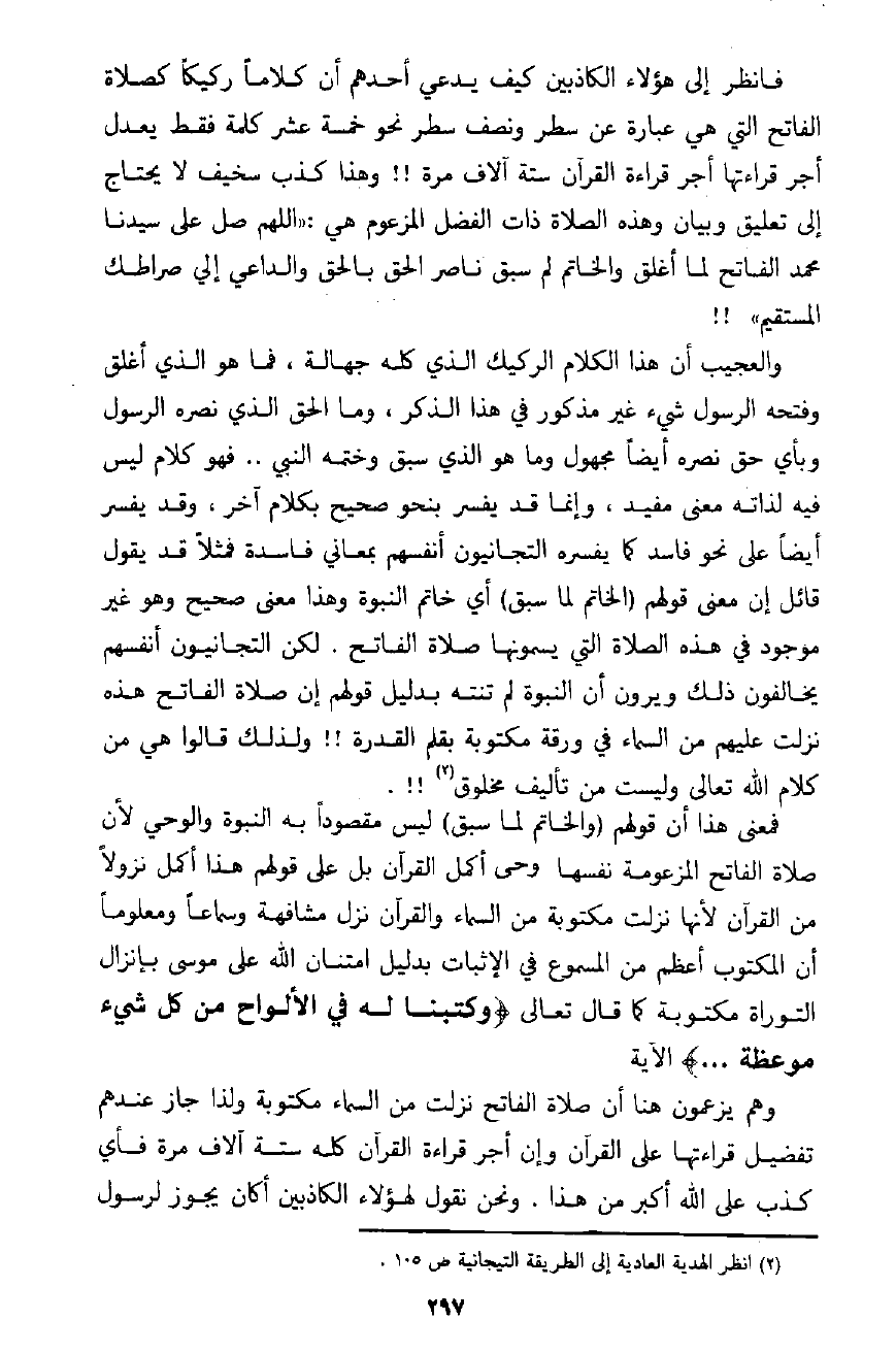 كيف يذكرون الله ويحمدونه ويمجدونه، وأن ذلك بوحي من الله له، ولكن الصوفية انفردوا عن جميع المسلمين فزعموا أن الرسول يأتيهم بعد موته ـ صلى الله عليه وسلم ـ والتحاقه بالرفيق الأعلى ليعلمهم الطريقة الشاذلية! ! يقول صالح محمد الجعفري الذي كان إمامًا لمسجد الأزهر لمدة طويلة (هذه الدعوى بالطبع هي الباب الذي يدخل منه هؤلاء على المسلمين بالخرافات والخزعبلات التي ينسبونها إلى الرسول، ويدعون بها الغيب فما دام أنه رزق عيونًا إلهية فلماذا لا يطلع على الغيب) ، في كتابه الذي سماه (مفاتيح كنوز السماوات والأرض المخزونة التي أعطاها ـ صلى الله عليه وسلم ـ لشيخ الطريقة الإدريسية المصونة! !) .