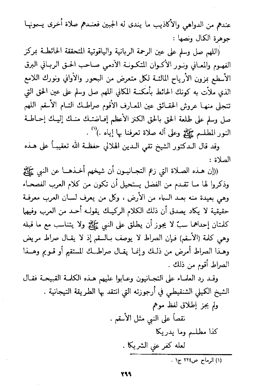 ويحتار فيها العلماء ويختلفون. ثم لننظر ما هي الأوراد والأدعية التي جاء الرسول في زعمهم ليعلمها لهؤلاء، إنها كلمات ركيكة التركيب العربي، فيها جهل عظيم بالله سبحانه وتعالى، وتقول عليه سبحانه وتعالى، وفيها اعتداء في الدعاء بكل معاني الاعتداء، وفيها من أسماء الشياطين ما فيها. وإليكم نماذج من هذه الأدعية التي يزعم أصحابها أنهم اجتمعوا بالرسول ـ صلى الله عليه وسلم ـ وعلمها لهم. هذه هي الصلاة التي يسمونها (الصلاة العظيمية) ! ! هكذا (والعظيمية! !) وهي: