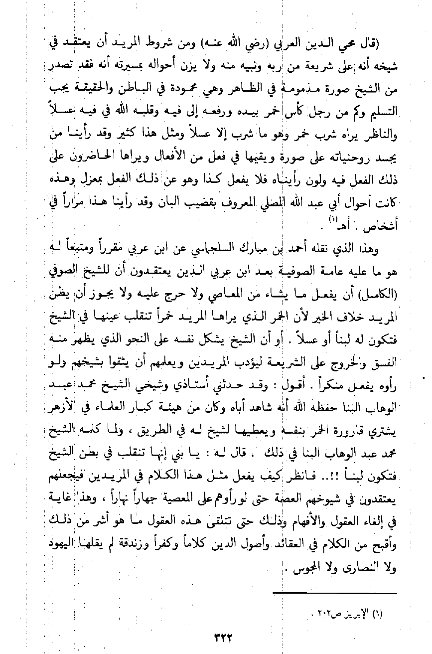 2 ـ إن هذه العبارات قد تلقاها تلاميذ التصوف بالقبول واعتقدوا ما فيها بل وشرحوا العقيدة التي تشير هذه العبارات إليها في كتب كاملة. . والعقيدة هذه هي أن الأديان جميعًا دين واحد، وأن الخلق جميعًا هم عين الخالق وأنه لا موجود إلا الله! ! وأن هذا الخنزير الذي كان يمر به أحدهم فيقول له عم صباحًا! ! هم مظهر من مظاهر الخالق ـ تعالى الله عما يقولون علوًا كبيرًا ـ ونستغفر الله من كتابة أقوالهم وإعادتها وكذلك هذه الشاة التي ترغي فيقول لها أحدهم لبيك يا سيدي، ما قال ذلك في غلبة السكر، وفي رؤيته للنار أو النعيم، ولا لتذكره لآية من كتاب الله وإنما قال ذلك لأنه سمع ثغاء شاة، أو نباح كلب، ومثل هذه الأصوات لا تخلق في المسلم (حالة) ولا تجعل عنده وجدًا يحمله على الغياب عن الوعي حتى يقول مجيبًا له " لبيك يا سيدي "! !