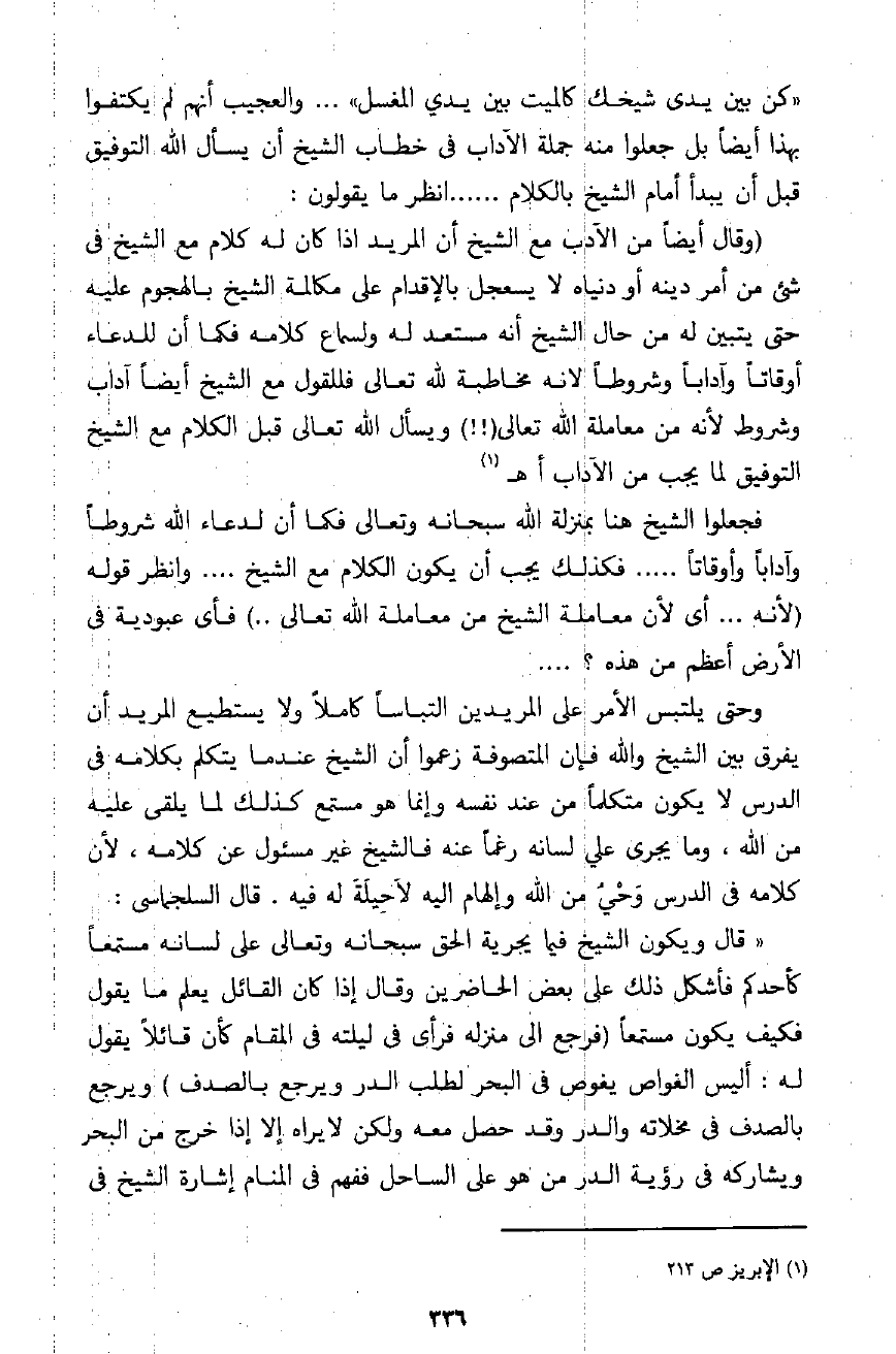 4 ـ لم يقتصر الأمر على طاعة الشيخ فيما لا فائدة منه ولا معقولية له بل تعدى الأمر ذلك إلى الاعتقاد أن للشيخ شريعته الخاصة، ودينه المستقل فله أن يشرب الخمر، أو يزني وليس لمريده أن يسأل عن شيء من ذلك. يقول السلجماسي أيضًا: