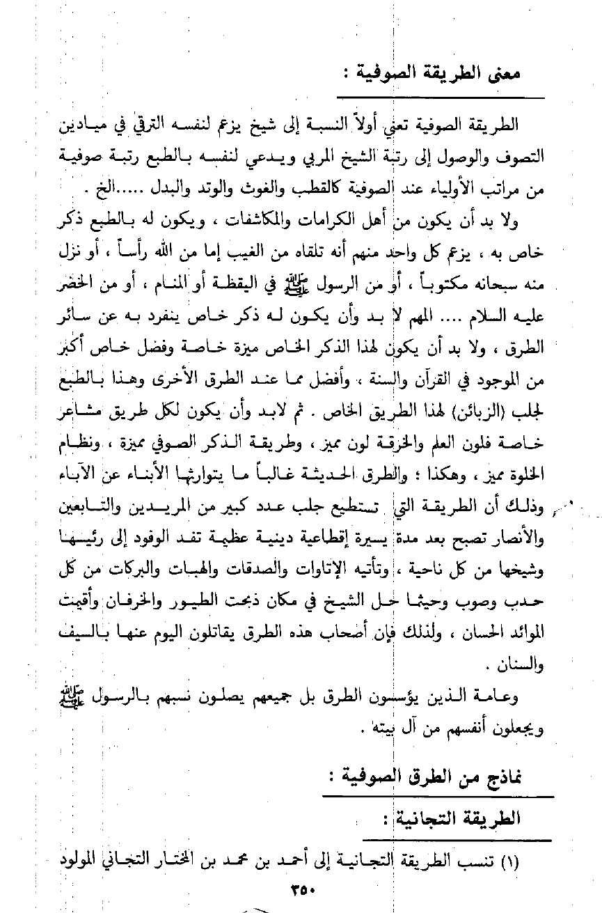 وليت أنهم أعطوا الشيخ من الحقوق ما يجب على المسلم نحو الرسول واكتفوا بذلك بل جعلوا لشيوخهم من الحقوق على مريديهم ما لم يجعله الله سبحانه لرسوله ـ صلى الله عليه وسلم ـ فقد جعلوا من حق الشيخ أن لا تنطق عنده إلا بإذنه وأن تطيل إذا أحب منك الإطالة وتختصر إذا أراد الاختصار.