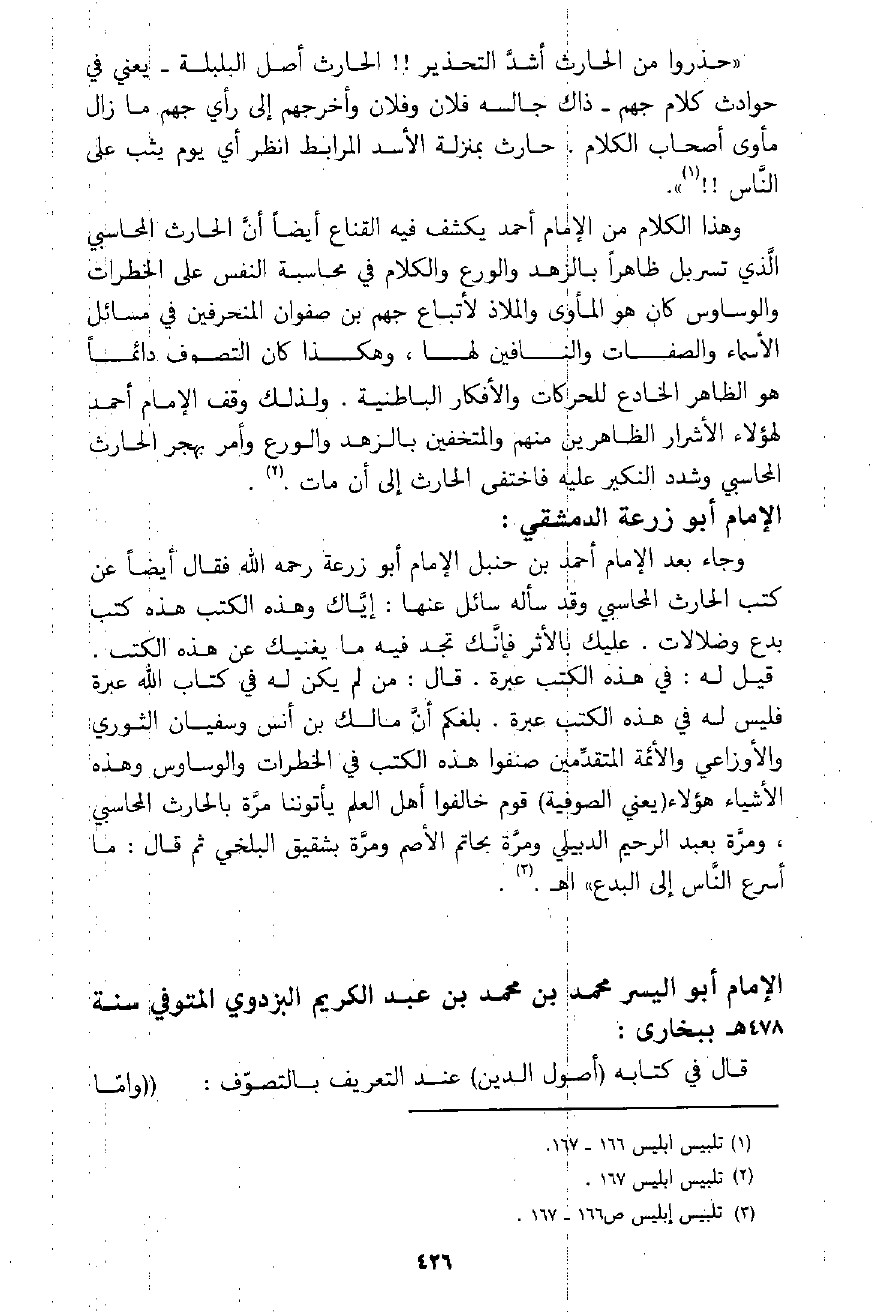 فقال: فبأي شيء تبطل هذه الأحوال؟ فقلت: بهذه السياط الشرعية. فأعجب الأمير وضحك، وقال: أي والله! بالسياط الشرعية، تبطل هذه الأحوال الشيطانية، كما قد جرى مثل ذلك لغير واحد، ومن لم يجب إلى الدين بالسياط الشرعية فبالسيوف المحمدية. وأمسكت سيف الأمير وقلت: هذا نائب رسول الله ـ صلى الله عليه وسلم ـ وغلامه، وهذا السيف سيف رسول الله ـ صلى الله عليه وسلم ـ. فمن خرج عن كتاب الله وسنة رسوله ضربناه بسيف الله، وأعاد الأمير هذا الكلام، وأخذ بعضهم يقول: فاليهود والنصارى يقرون ولا نقر نحن؟ فقلت: اليهود والنصارى يقرون بالجزية على دينهم المكتوم في دورهم، والمبتدع لا يقر على بدعته، فأفحموا لذلك.