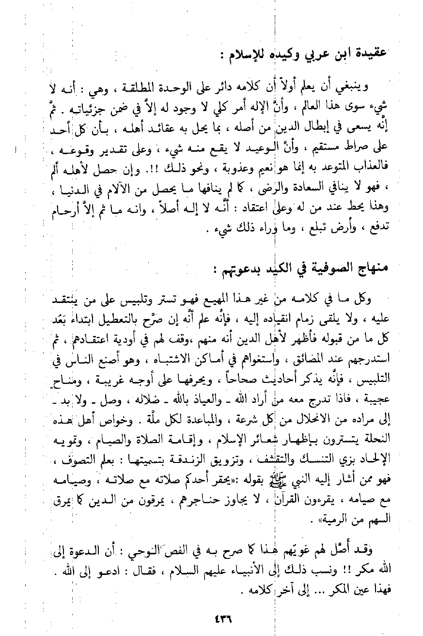 " ثم إن هؤلاء المتأخرين من المتصوفة المتكلمين في الكشف وفيما وراء الحس توغلوا في ذلك، فذهب الكثير منهم إلى الحلول وفيما وراء الحس، توغلوا في ذلك، فذهب الكثير منهم إلى الحلول والوحدة. . وملأوا الصحف منه مثل الهروي في كتاب المقامات له، وغيره، وتبعهم ابن العربي وابن سبعين وتلميذهما، ثم ابن العفيف وابن الفارض، والنجم الإسرائيلي في قصائدهم، وكان سلفهم مخالطين للإسماعيلية المتأخرين من الرافضة الدائنين أيضًا بالحلول وإلهية الأئمة مذهبًا لم يعرف لأولهم فأشرب كل واحد من الفريقين مذهب الآخر واختلط كلامهم وتشابهت عقائدهم، وظهر في كلام المتصوفة القول بالقطب، ومعناه رأس العارفين يزعمون أنه لا يمكن أن يساويه أحد في مقامه في المعرفة حتى يقبضه الله، ثم يورث مقامه لآخر من أهل العرفان وقد أشار إلى ذلك ابن سينا في كتاب الإشارات في فصول التصوف منها فقال: " جل جناب الحق أن يكون شرعه لكل وارد، أو يطلع عليه إلا الواحد بعد الواحد " وهكذا كلام لا تقوم عليه حجة عقلية ولا دليل شرعي، وإنما هو نوع من أنواع الخطابة، وهو