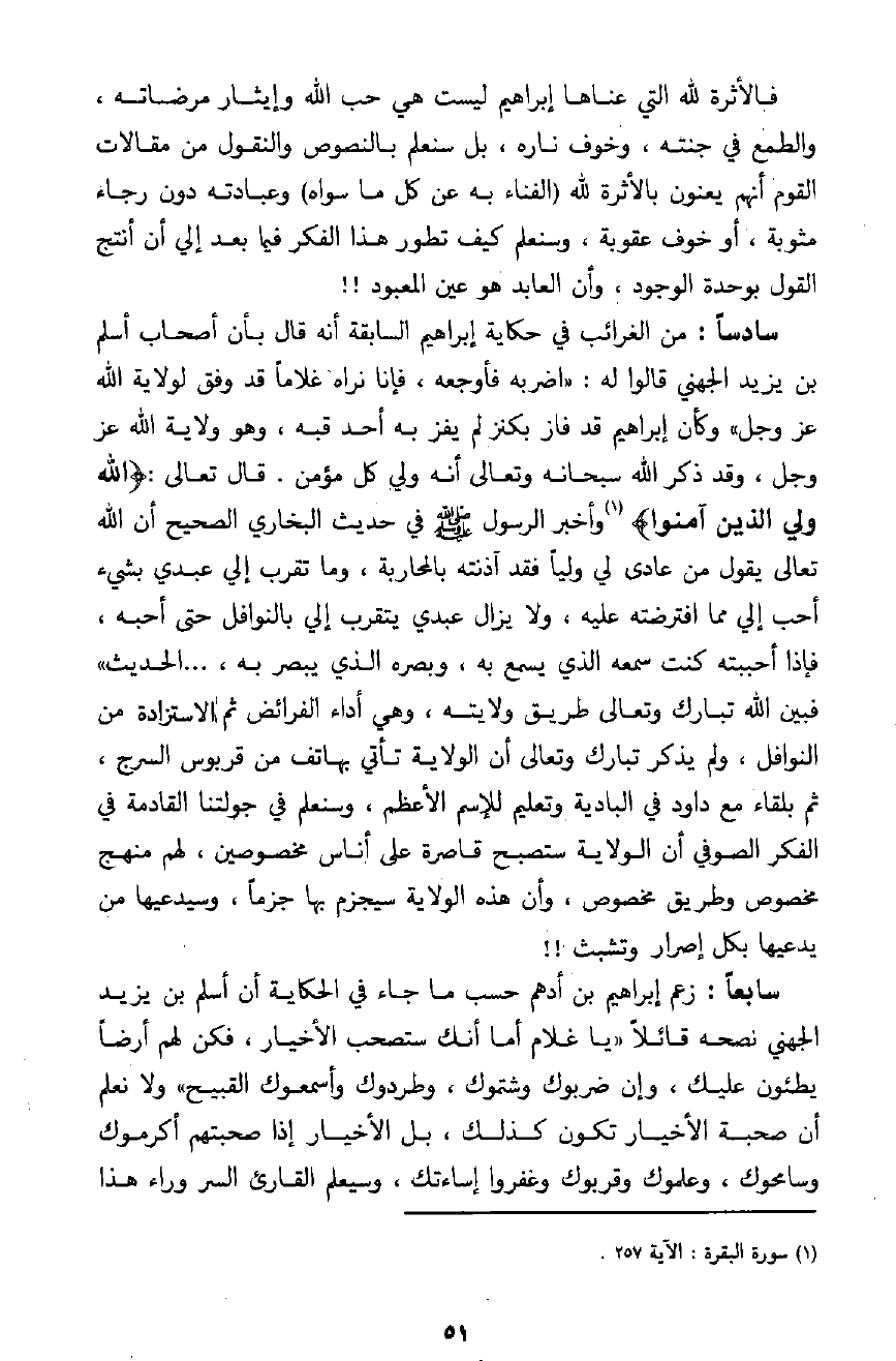 ثانيًا: الهداية التي ادعاها أبو عبد الرحمن السلمي لإبراهيم بن أدهم قد حملته على ترك أبيه وأمه وبلدته وخلع ثيابه، (وترك الدنيا) على حد التعبير، وليس ملابس الصوف التي كانت على جسم الراعي، ومن سمي هذا المنهج بالتصوف، وليس من شروط الهداية في الإسلام أن يترك المهتدي الدنيا، ويفر بدينه من وطنه، إلا إذا قابل فيه اضطهادًا أو منعًا من أداء الشعائر، أو كان في بلد كثير المعاصي وأراد النقلة إلى بلد آخر يكثر فيه الصالحون، ولم تكن (بلخ) التي هجرها إبراهيم كذلك؛ لأنه جاء في حكايته أنها مسكن (داود) وأن البقاع قد تفاخرت بكينونة داود فيها، هكذا قال، فكيف تترك هذه البقعة الطيبة، والقرية التي سميت (الباردة الطيبة) التي يسكن فيها داود ويخرج إلى البراري والقفار، وليس من سبب شرعي لهذا التحول؟
