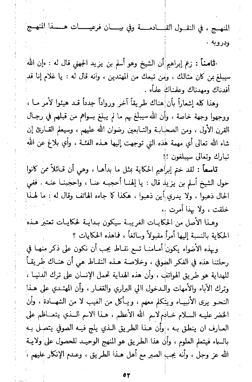 ثم لماذا يقول الخضر لإبراهيم بن أدهم ـ كما جاء في الحكاية ـ: لقد تعلمت اسم الله الأعظم، فلا تدع به على أحد بينك وبينه شحناء، فتهلكه هلاك الدنيا والآخرة، هكذا وإبراهيم بن أدهم ليس معصومًا، فربما تخاصم مع رجل مسلم، فإذا دعا باسم الله الأعظم على هذا الرجل هلك هلاك الدنيا والآخرة، وحرم جنة الله، وباء بالنار، لأنه خاصم إبراهيم بن أدهم فقط، وهذا ليس للرسول، لأن الرسول دعا على أناس فقال له الله: {ليس لك من الأمر شيء} [آل عمران: 128] . (انظر حديث البخاري في شأن نزول هذه الآية) . هذا مع أن الحال في الخصومة بين النبي ـ صلى الله عليه وسلم ـ وبين أعدائه إنما هو من أجل