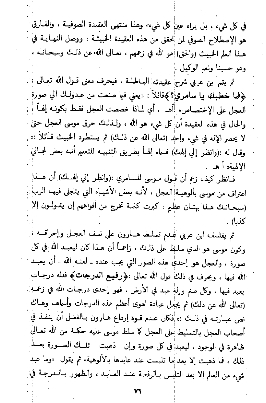 وبالرغم من أن ابن عربي هذا قد زعم أنه نقل علمه وكتبه عن الرسول ـ صلى الله عليه وسلم ـ مباشرة، وكتب عن اللوح المحفوظ بلا وساطة، وصاغ عقيدة وحدة الوجود بكل جرأة وبلا مواربة، بل بقليل من التدليس والمراوغة، واستطاع أن يحرف آيات القرآن فيزعم أن قوم هود الكافرين كانوا على الصراط المستقيم، وأن فرعون كان مؤمنًا كامل الإيمان، وأن قوم نوح كانوا مؤمنين، فجازاهم الله بأن أغرقهم في بحار الوحدة، وأدخلهم نار الحب الإلهي ليتنعموا فيها، وأن هارون أخطأ لأنه نهى بني إسرائيل عن عبادة العجل، وما كان العجل إلا المعبود الحق، أو صورة من صور المعبود الحق، وأن قوم نوح أصابوا في عدم تركهم ودًا وسواعًا ويغوث ويعوق ونسرًا لأنها مظاهر للإله الواحد، وأن النار عذوبة لا عذاب، وأنه ما من إنسان إلا مرحوم مرضي عنه، وأن الله لا يعلم شيئًا قبل وجوده، لأن وجود الشيء هو وجود العلم، بل وجود كل شيء هو ترجمة لوجود الله (تعالى الله عن ذلك) أقول: بالرغم من أن ابن عربي قال هذا الكلام كله، بل هذا جزء يسير جدًا مما قاله، فإنه أدعى بأن كل ذلك قد نقله بلا زيادة ولا نقصان عن الرسول الذي أمره بتبليغ ذلك للناس، وبالرغم أيضًا من كل ذلك فقد وجد هذا الرجل من المروجين والأتباع ما لا يقع تحت الحصر منذ ظهوره إلى زماننا هذا، ومن أمة الإسلام الذين يشهدون في كل يوم مرات كثيرة بأن لا إله إلا الله وأن محمدًا رسول الله، وهذا من أعجب العجب.