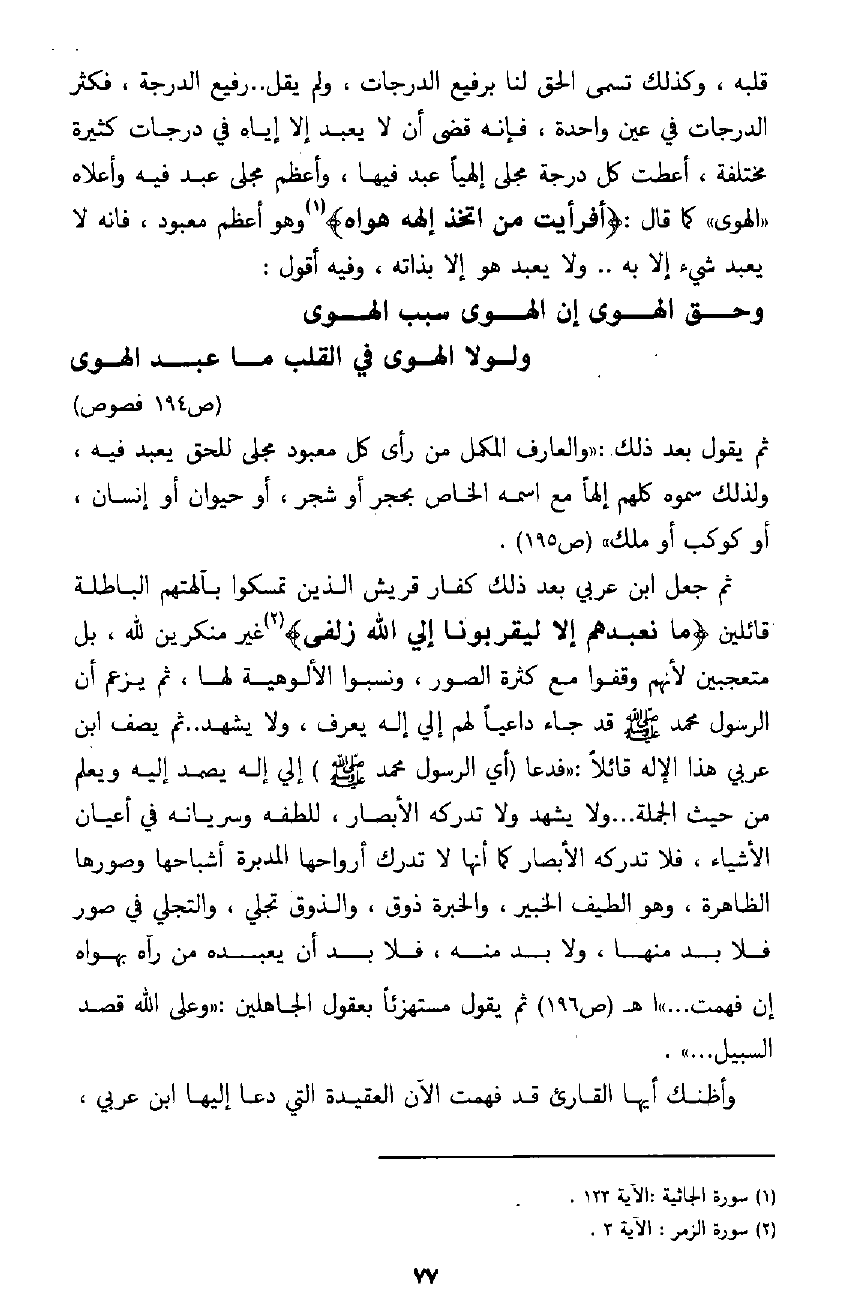 2 ـ يزعم ابن عربي أن قوم نوح أجابوا رسولهم إجابة حقيقية، وأن نوحًا مكر بهم فمكروا به، وأن تمسكهم بآلهتهم إنما هو تمسك بحق أراد نوح أن يزيلهم عنه، وهاك نص عباراته في ذلك: