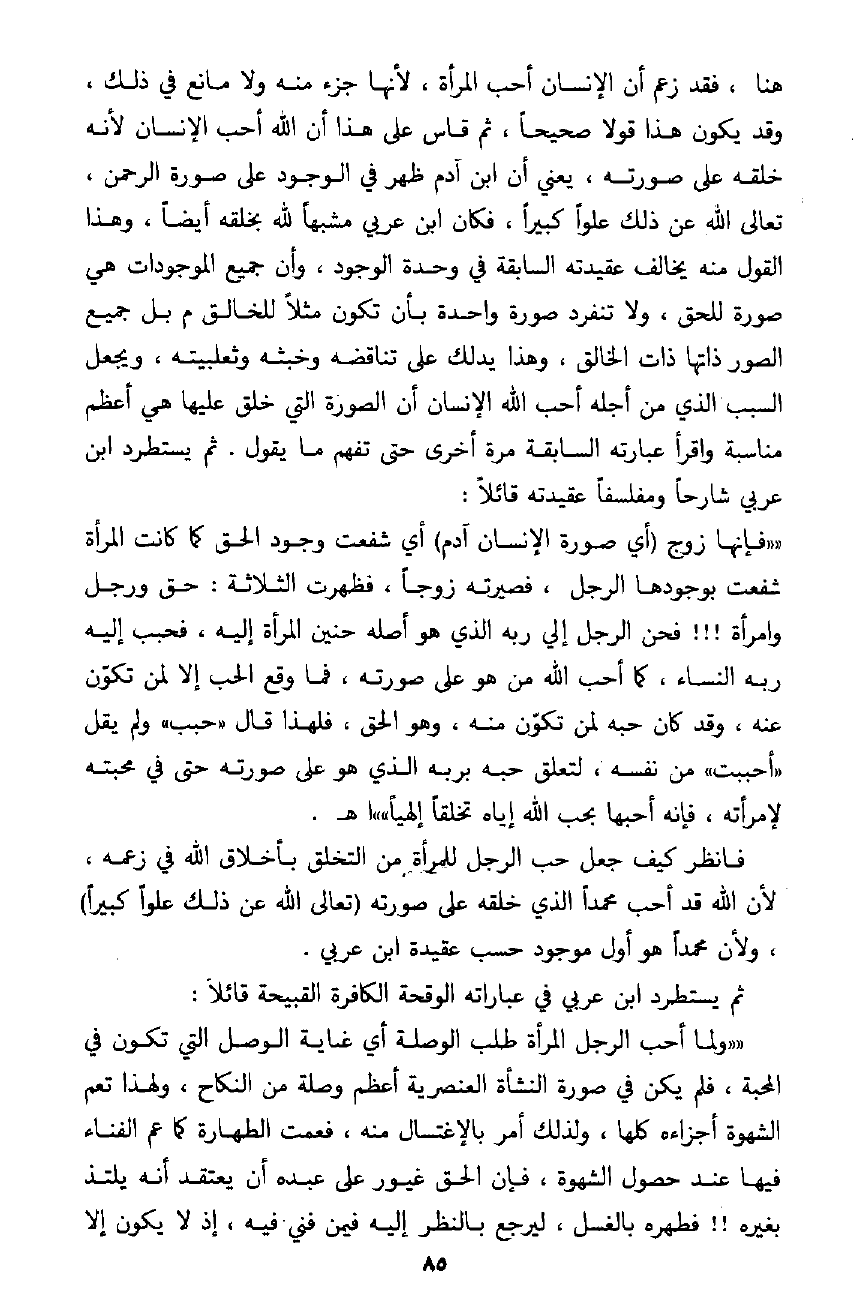 أقول مع هذا يعود ويقرر دون شك أن النار ستكون بردًا وسلامًا على أهلها، كما كانت نار إبراهيم بردًا وسلامًا عليه، يقول في (الفصوص ص169) : " وأما أهل النار فمآلهم إلى النعيم ولكن في النار. . إذ لا بد لصورة النار بعد انتهاء مدة العقاب أن تكون بردًا وسلامًا على من فيها، وهذا نعيمهم، فينعم أهل النار بعد استيفاء الحقوق نعيم خليل الله حين ألقي في النار، فإنه ـ عليه السلام ـ تعذب برؤيتها.
