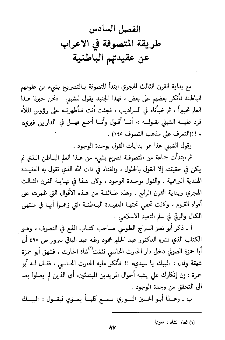 عليه، ولذلك فسأسرد لك طائفة أخرى من الشرح التفصيلي لهذه العقيدة، وكل هذا الشرح من كلام القوم حتى لا يبقى عندك في الحق لبس، ولتعلم أيضًا أن من زعم منهم أن هذا الكلام المنقول عن أساتذة الضلال إنما هو شطح فقط، وغلبة حال فزعمه باطل، لأن الأمر ليس شطحًا، وإنما هو عقيدة فلسفية مقررة مشروحة في عشرات الكتب، وأن كل آي القرآن قد حرفوها واستدلوا بها، ليغيروا عقيدة المسلمين الحقة في إلههم سبحانه وتعالى، الذي يتصف بصفات الكمال، والذي لا يشبه أحدًا من خلقه، بل هو الله الواحد الأحد، الفرد الصمد، الذي لم يلد ولم يولد، ولمن يكن له كفوًا أحد.