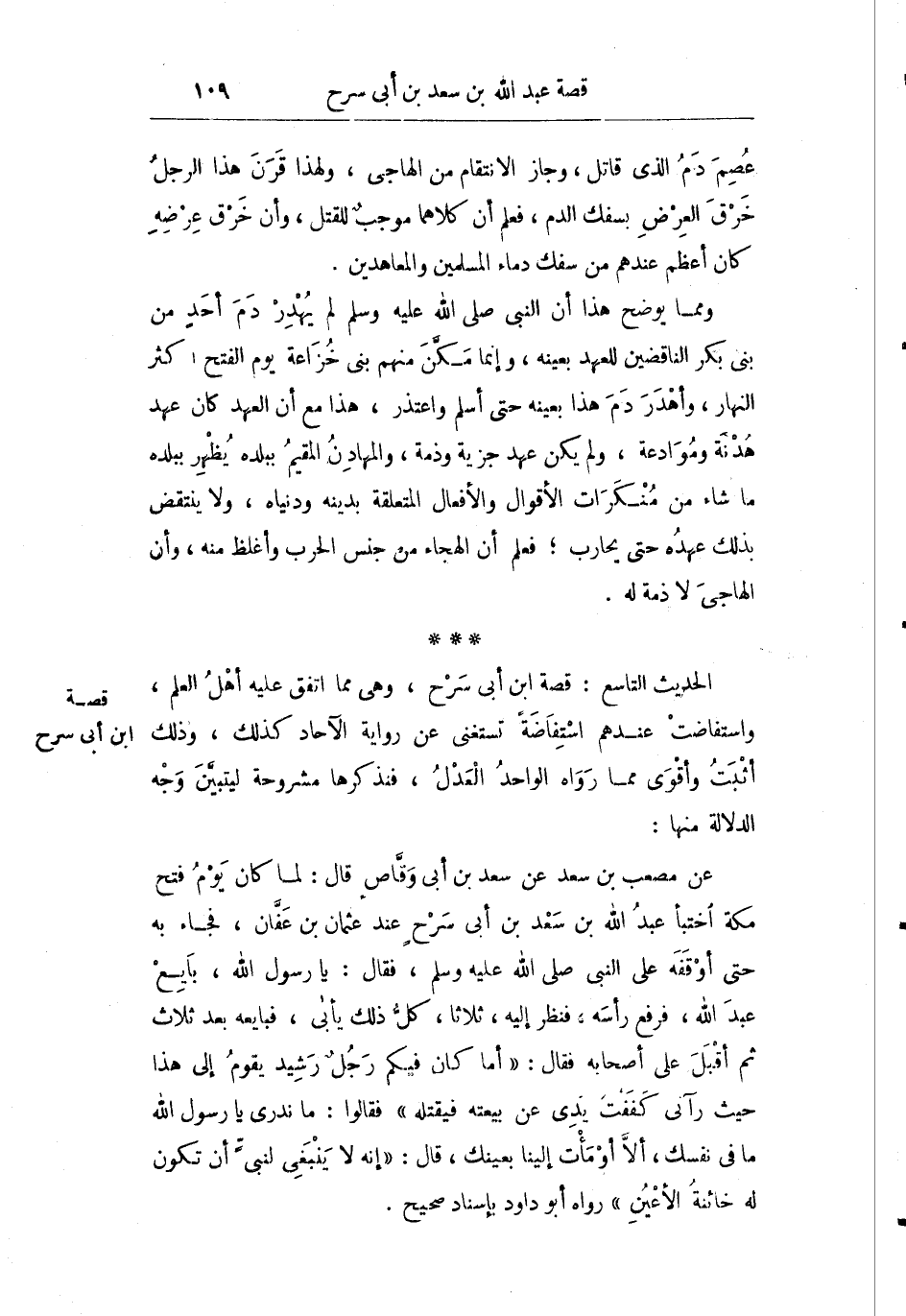 الحديث التاسع: قصة ابن أبي سرح وهي مما اتفق عليها أهل العلم واستفاضت عندهم استفاضة تستغنى عن رواية الآحاد وذلك أثبت وأقوى مما رواه الواحد العدل فنذكرها مشروحة ليتبين وجه الدلالة منها: