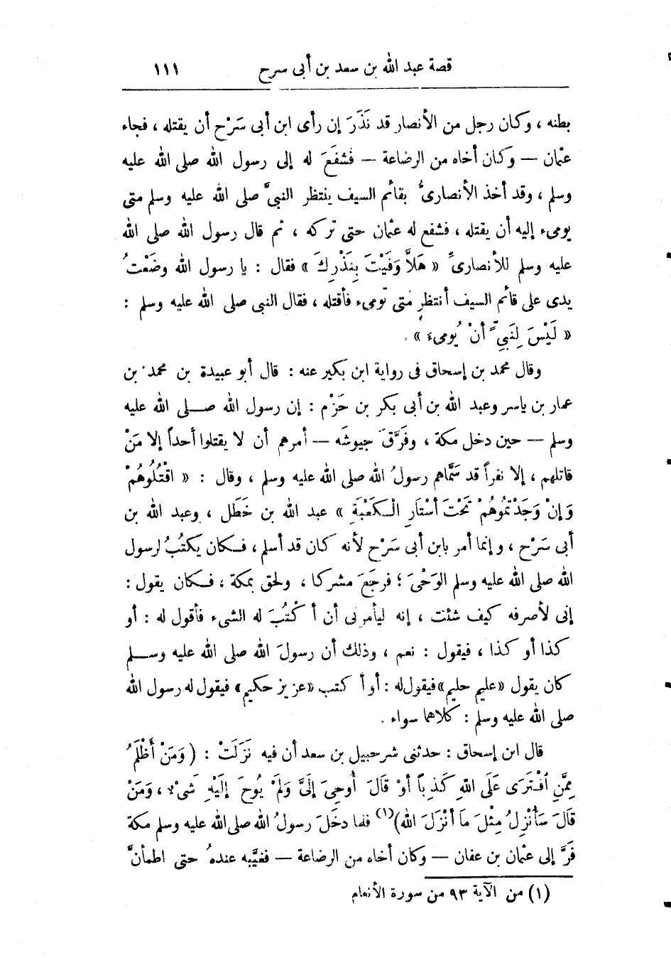 بطنه وكان رجل من الأنصار قد نذر إن رأى ابن أبي سرح أن يقتله فجاء عثمان وكان أخاه من الرضاعة فشفع له إلى رسول الله صلى الله عليه وسلم وقد أخذ الأنصاري بقائم السيف ينظر إلى النبي صلى الله عليه وسلم متى يومئ إليه أن يقتله فشفع له عثمان حتى تركه ثم قال رسول الله صلى الله عليه وسلم للأنصاري: "هلا وفيت بنذرك" فقال: يا رسول الله وضعت يدي على قائم السيف أنتظر متى تومئ فأقتله فقال النبي صلى الله عليه وسلم: "ليس لنبي أن يومئ".
