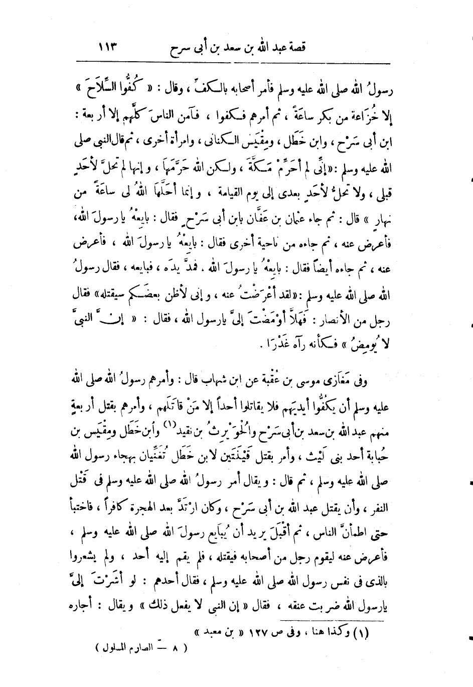 وفي مغازي موسى بن عقبة عن ابن شهاب قال: وأمرهم رسول الله صلى الله عليه وسلم أن يكفوا أيديهم فلا يقاتلوا أحدا إلا من قاتلهم وأمرهم بقتل أربعة منهم عبد الله بن سعد بن أبي سرح والحويرث بن نقيد وابن خطل ومقيس بن حبابة أحد بني ليث وأمر بقتل قينتين لابن خطل تغنيان بهجاء رسول الله صلى الله عليه وسلم ثم قال: ويقال أمر رسول الله صلى الله عليه وسلم في قتل النفر وأن يقتل عبد الله بن أبي سرح وكان ارتد بعد الهجرة كافرا فاختبأ حتى اطمأن الناس ثم أقبل يريد أن يبايع رسول الله صلى الله عليه وسلم فأعرض عنه ليقوم رجل من أصحابه فيقتله فلم يقم إليه أحد ولم يشعروا بالذي في نفس رسول الله صلى الله عليه وسلم فقال أحدهم: لو أشرت إلي يا رسول الله ضربت عنقه فقال "إن النبي لا يفعل ذلك" ويقال: أجاره