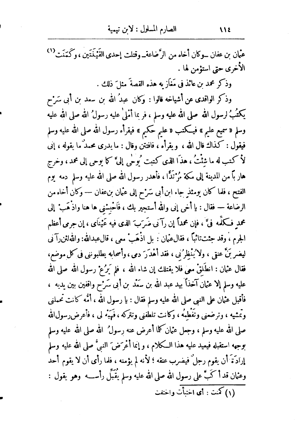 وذكر الواقدي عن أشياخه قالوا: وكان عبد الله بن سعد بن أبي سرح يكتب لرسول الله صلى الله عليه وسلم فربما أملى عليه رسول الله صلى الله عليه وسلم "سميع عليم" فيكتب "عليم حكيم" فيقرأه رسول الله صلى الله عليه وسلم فيقول: كذاك قال الله ويقرأه فافتتن وقال: ما يدري محمد ما يقوله إني لأكتب له ما شئت هذا الذي كتبت يوحى إلي كما يوحى إلى محمد وخرج هاربا من المدينة إلى مكة مرتدا فأهدر رسول الله صلى الله عليه وسلم دمه يوم الفتح فلما كان يومئذ جاء ابن أبي سرح إلى عثمان بن عفان وكان أخاه من الرضاعة فقال: يا أخي إني والله أستجير بك فاحبسني ها هنا واذهب إلى محمد فكلمه في فإن محمدا إن رآني ضرب الذي فيه عيناي إن جرمي أعظم الجرم وقد جئت تائبا فقال عثمان: بل اذهب معي قال عبد الله: والله لئن رآني ليضربن عنقي ولا ينظرني قد أهدر دمي وأصحابه يطلبونني في كل موضع فقال عثمان: انطلق معي فلا يقتلك إن شاء الله فلم يرع رسول الله صلى الله عليه وسلم إلا عثمان آخذا بيد عبد الله بن سعد ابن أبي سرح واقفين بين يديه فأقبل عثمان على النبي صلى الله عليه وسلم فقال: يا رسول الله أمه كانت تحملني وتمشيه وترضعني وتفطمه وكانت تلطفني وتتركه فهبه لي فأعرض رسول الله صلى الله عليه وسلم وجعل عثمان كلما أعرض عنه رسول الله صلى الله عليه وسلم بوجهه استقبله فيعيد عليه هذا الكلام وإنما أعرض النبي صلى الله عليه وسلم إرادة أن يقوم رجل فيضرب عنقه لأنه لم يؤمنه فلما رأى أن لا يقوم أحد وعثمان قد أكب على رسول الله صلى الله عليه وسلم يقبل رأسه وهو يقول: