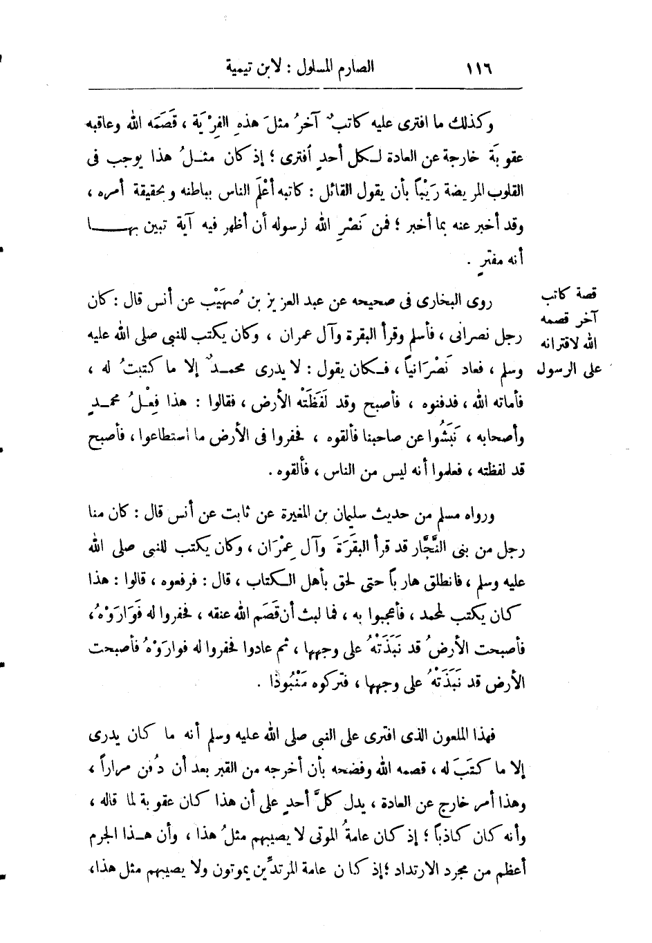 وكذلك ما افترى عليه كاتب آخر مثل هذه الفرية قصمه الله وعاقبه عقوبة خارجة عن العادة ليتبين لكل أحد افتراؤه إذ كان مثل هذا يوجب في القلوب المريضة ريبا بأن يقول القائل: كاتبه أعلم الناس بباطنه وبحقيقة أمره وقد أخبر عنه بما أخبر فمن نصر الله لرسوله أن أظهر فيه آية يبين بها أنه مفتر.