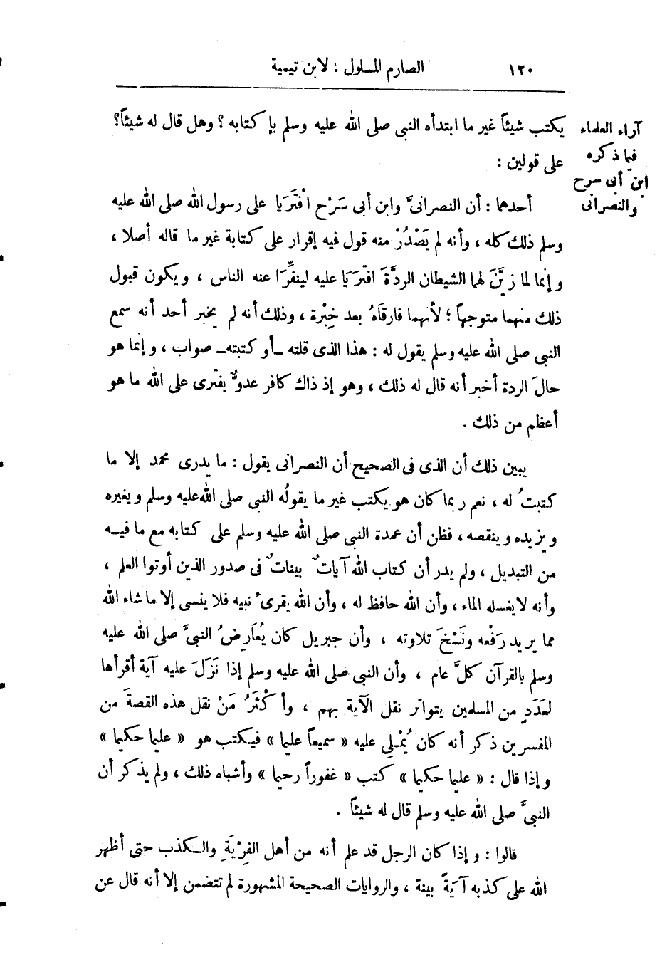 يبين ذلك أن الذي في الصحيح أن النصراني كان يقول: ما يدري محمد إلا ما كتبت له نعم ربما كان هو يكتب غير ما يقوله النبي صلى الله عليه وسلم ويغيره ويزيده وينقصه فظن أن عمدة النبي صلى الله عليه وسلم على كتابته مع ما فيه من التبديل ولم يدر أن كتاب الله آيات بينات في صدور الذين أوتوا العلم وأنه لا يغسله الماء وأن الله حافظ له وأن الله يقرئ نبيه فلا ينسى إلا ما شاء الله مما يريد رفعه ونسخ تلاوته وأن جبريل كان يعارض النبي صلى الله عليه وسلم بالقرآن كل عام وأن النبي صلى الله عليه وسلم إذا نزل عليه آية أقرأها لعدد من المسلمين يتواتر نقل الآية بهم وأكثر من نقل هذه القصة من المفسرين ذكر أنه كان يملي عليه {سَمِيعاً عَلِيماً} فيكتب هو {عَلِيماً حَكِيماً} وإذا قال: {عَلِيماً حَكِيماً} كتب {غَفُوراً رَحِيماً} وأشباه ذلك ولم يذكر أن النبي صلى الله عليه وسلم قال له شيئا.